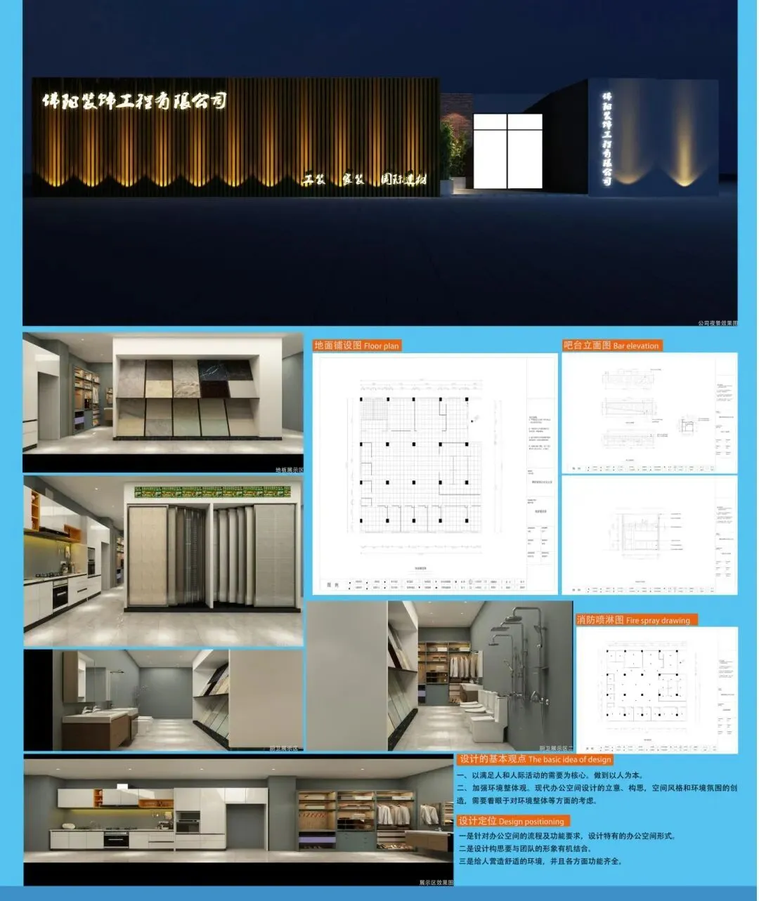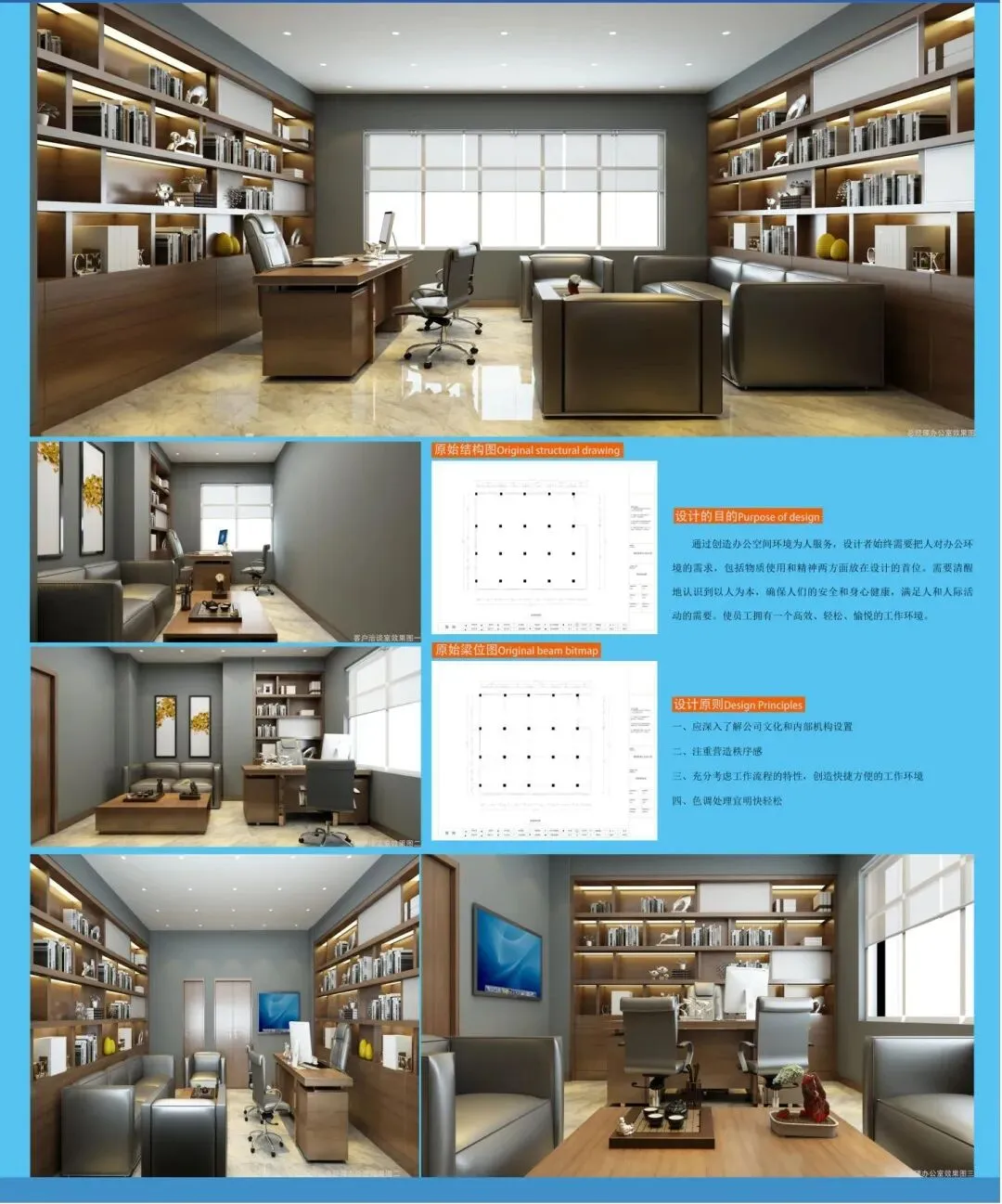 本设计追求空间的实用性与灵活性,使功能空间相互渗透,空间的利用率得以达到最高。通过装饰材料与色彩设计,为现代风格的办公空间提供了空间背景,力求表现一完全区别于传统风格的空间氛围,同时也重视人性化和创造性的表现,设计中还通过家具、灯具以及陈设品的造型,配合整体空间的设计主题,突出美观,从而为办公空间营造良好的工作氛围。现代风格简约和实用的特点,满足现代人们的审美需求,符合现代人们的生活品位,这也是现代风格流行这么久的原因。经过形象背景墙进入公司后,依次是前台→接待区与吧台→设计部与会议室→技术部→总工办→总经理室→业务经理室与材料展示区,会议室中有阅览室,财务室入口在业务经理室中,墙体与桌椅的摆放加入了独特的角度跟线条,使空间充满节奏感。