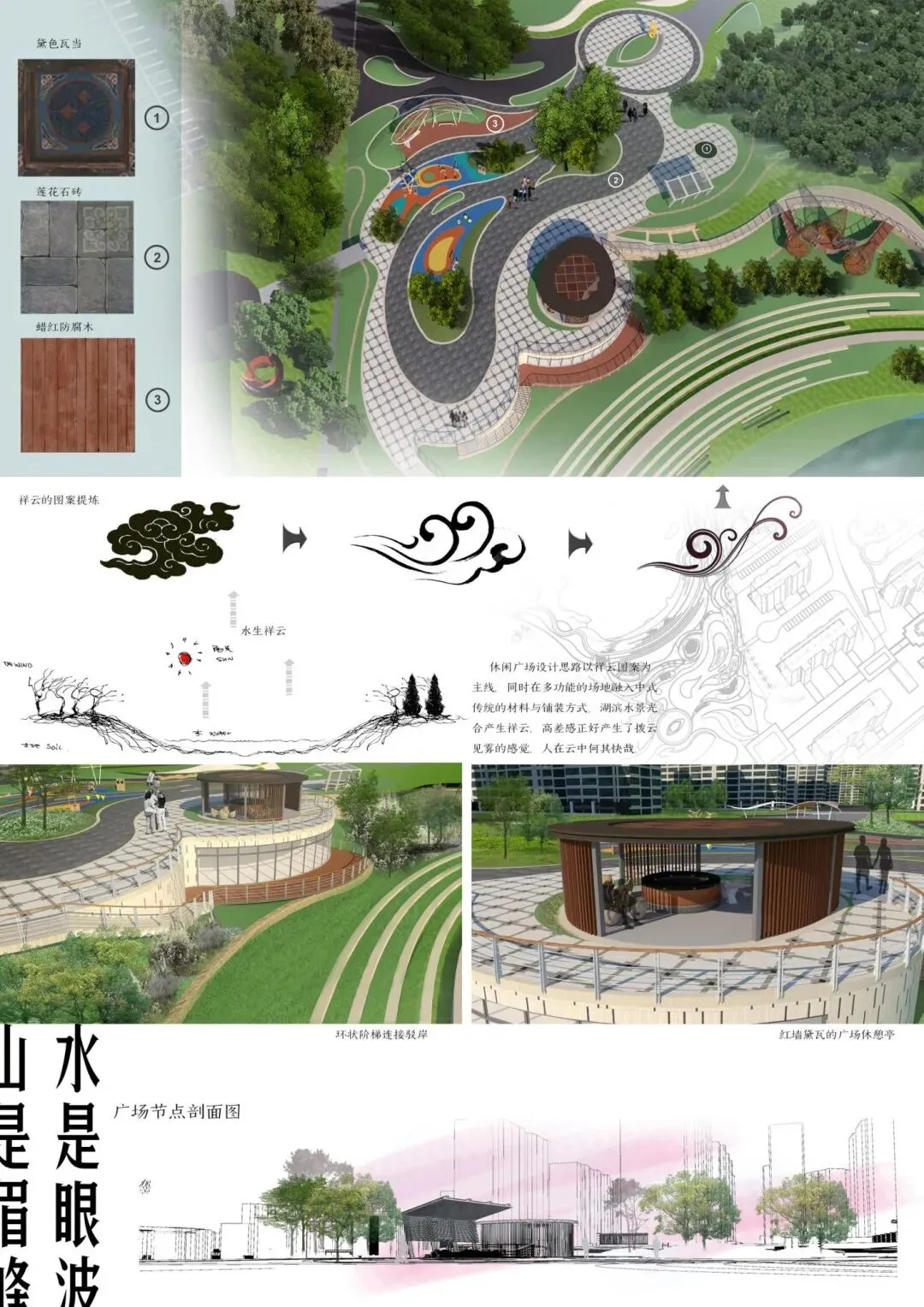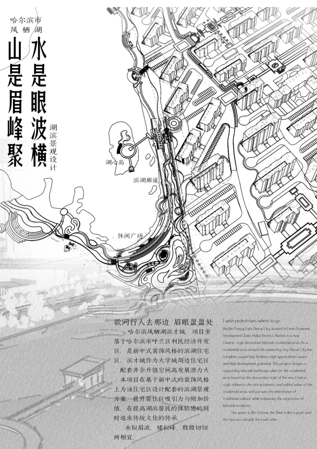 中式与现代的结合一直是个难题。就我个人来说,如果中式的特征不够浓厚,那就觉得有些食之无味,如果过于丰富,可能就与现代风格的融合较为突兀。这次的项目坐落于哈尔滨市呼兰区利民经济开发区,是新中式装饰风格的滨湖住宅区。滨才城作为大学城周边住宅区,配套齐全升值空间高发展潜力大。希望这次为该住宅区设计配套的滨湖景观方案能够提升居住区的吸引力与附加价值,提高北方湖滨居民的体验感与幸福感。这次的设计以湖滨景观入手,分为栈道、观景岛、休闲广场三个重点部分,在休闲广场中尝试运用了中式传统的铺装形式与材料,如黛色与瓦等要素。在赋予这些景观山水相融的理念后,钢筋水泥的中式居住区好像又带来了别样的柔情,墅与湖就像是山与水的结合,希望这个景观改造能够带来浓妆艳抹总相宜的协调。