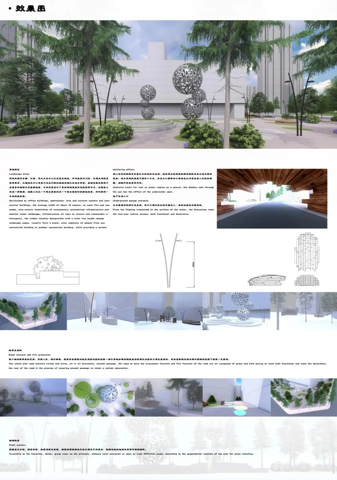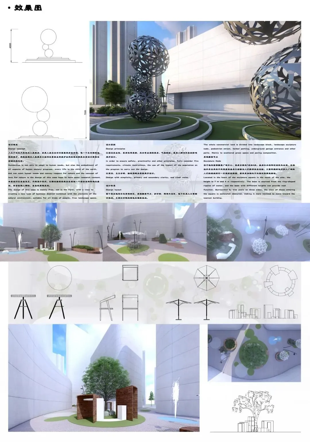 设计理念人文不仅仅只是适应人类需求,更是人类社会方方面面进步的体现,每一个生命都是地球的孩子,而既能满足人类需求又能传达尊重自然爱护自然的理念则是本案设计希望有所研究的内容。本案设计以自由为主,不拘泥于形式,以期在新型的商业区创造一个结合自然环境元素的、适合各种人群的、自由的景观空间。