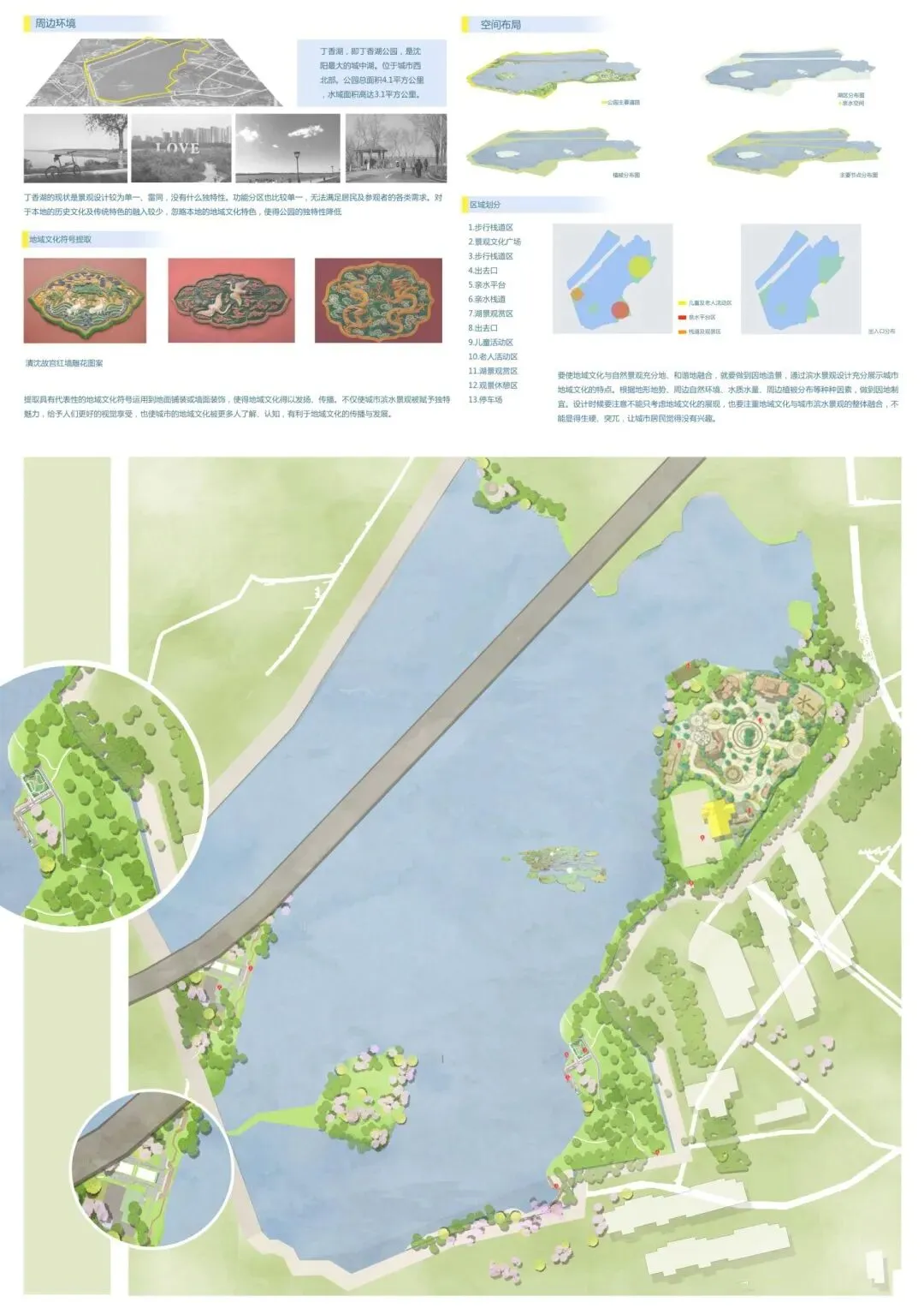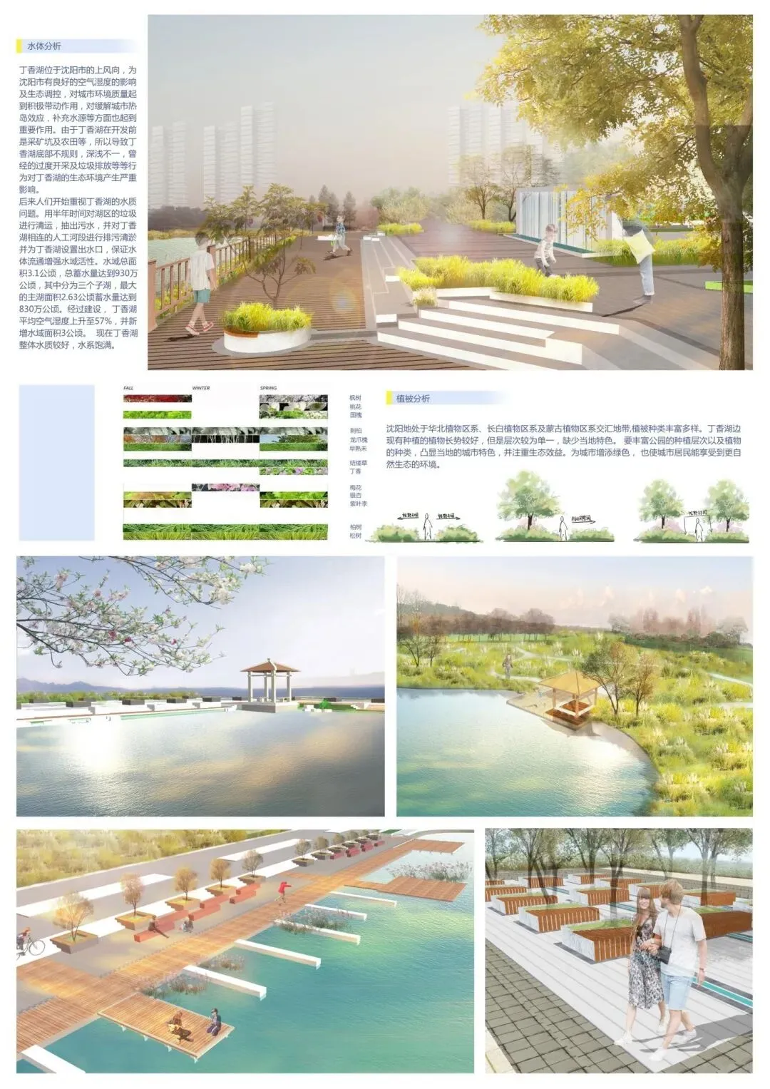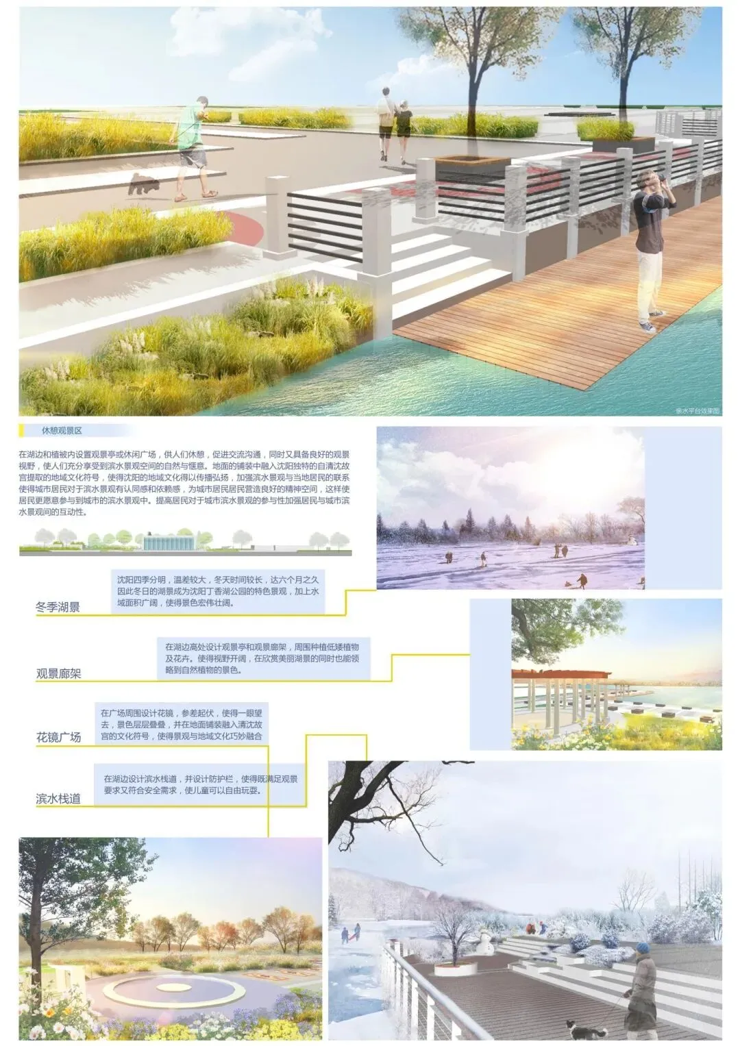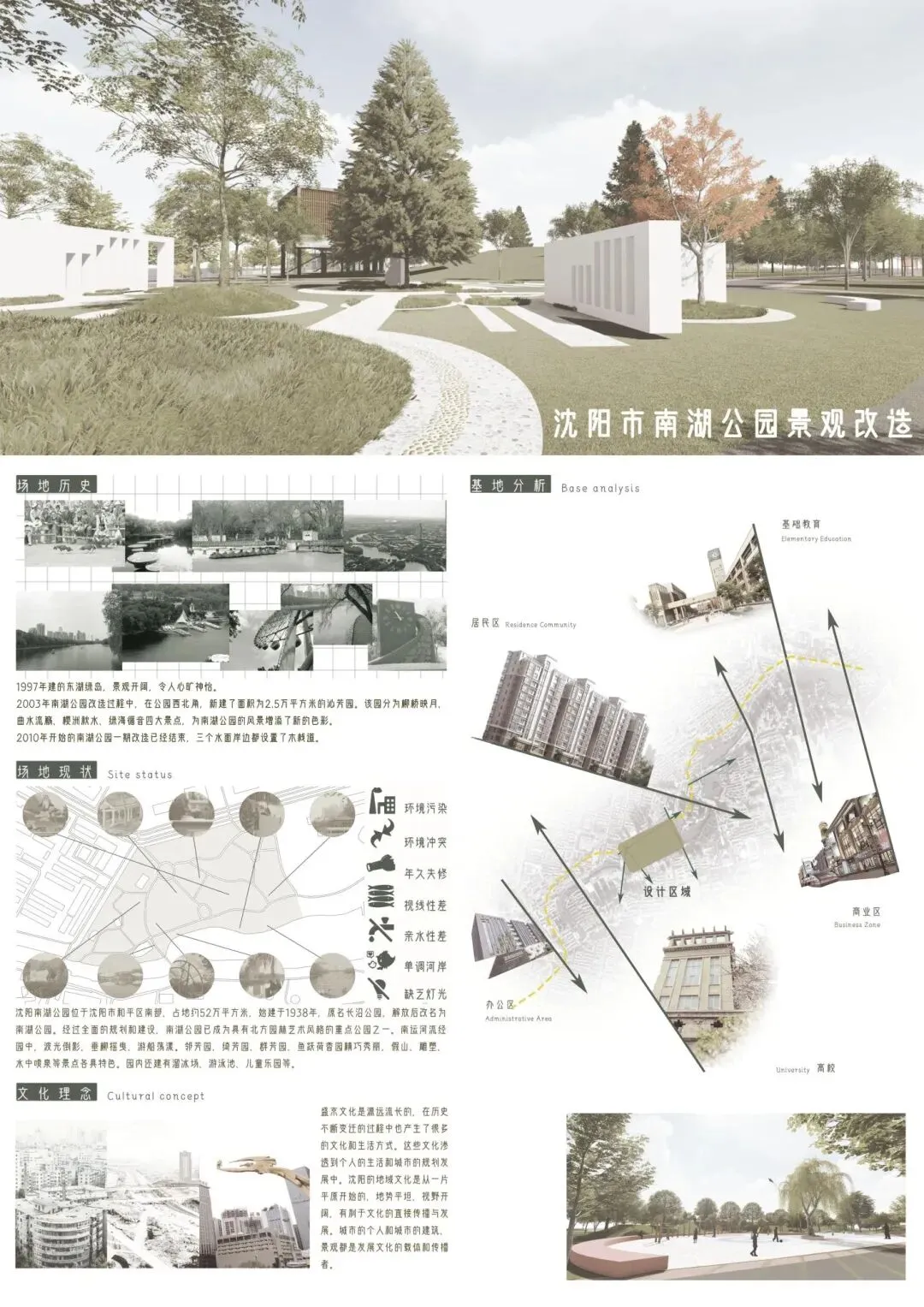 沈阳南湖公园现为一个具有简单的游步道及休息凉亭的部分开发的滨水公园,按照沈阳城市总体规划南湖公园建设年代较早,导致南湖公园现状并无法匹配当代城市居民需求,年久失修、缺乏灯光、设施老旧、环境污染等问题较为严重,公园附近居民区、高校以及办公区域较多,以至于公园客流量较大,为了满足居民需求,应对公园进行设计规划,在保留原始绿植面积和原来道路规划的基础上,适当增加建设节点,增加一些滨水设施,使其公园植物景观、生态景观、旅游休闲功能就显得更为突出。将公园的各功能区域融为一整体,实现功能区的协调,使滨水区域进一步成为城市主要景观点,也成为公园的优质观景点,根据长期、短期游客的不同行为特点,将观景道路规划成畅通流线,贯通各个景观以及建筑节点,丰富游览形式和游览内容,满足游览人群的不同需要,在原始观景的基础上增添更多的趣味性,使游览人群得以与水域、生态景观形成互动关系。在改造过程中,充分利用水域特点,并且遵照植物乡土性原则,更好地使得公园水域生态多样丰富,充分体现现有地形,以重点与一般布置相结合的原则。充分考虑别各年龄段游人的活动需求,坚持以人为本,对绿地进行功能分区。各功能分区即可以成为一个个相对独立的景观,又通过连贯的游览路线而成为一个有机整体。集休闲、游览、趣味于一体的滨水景观区域。