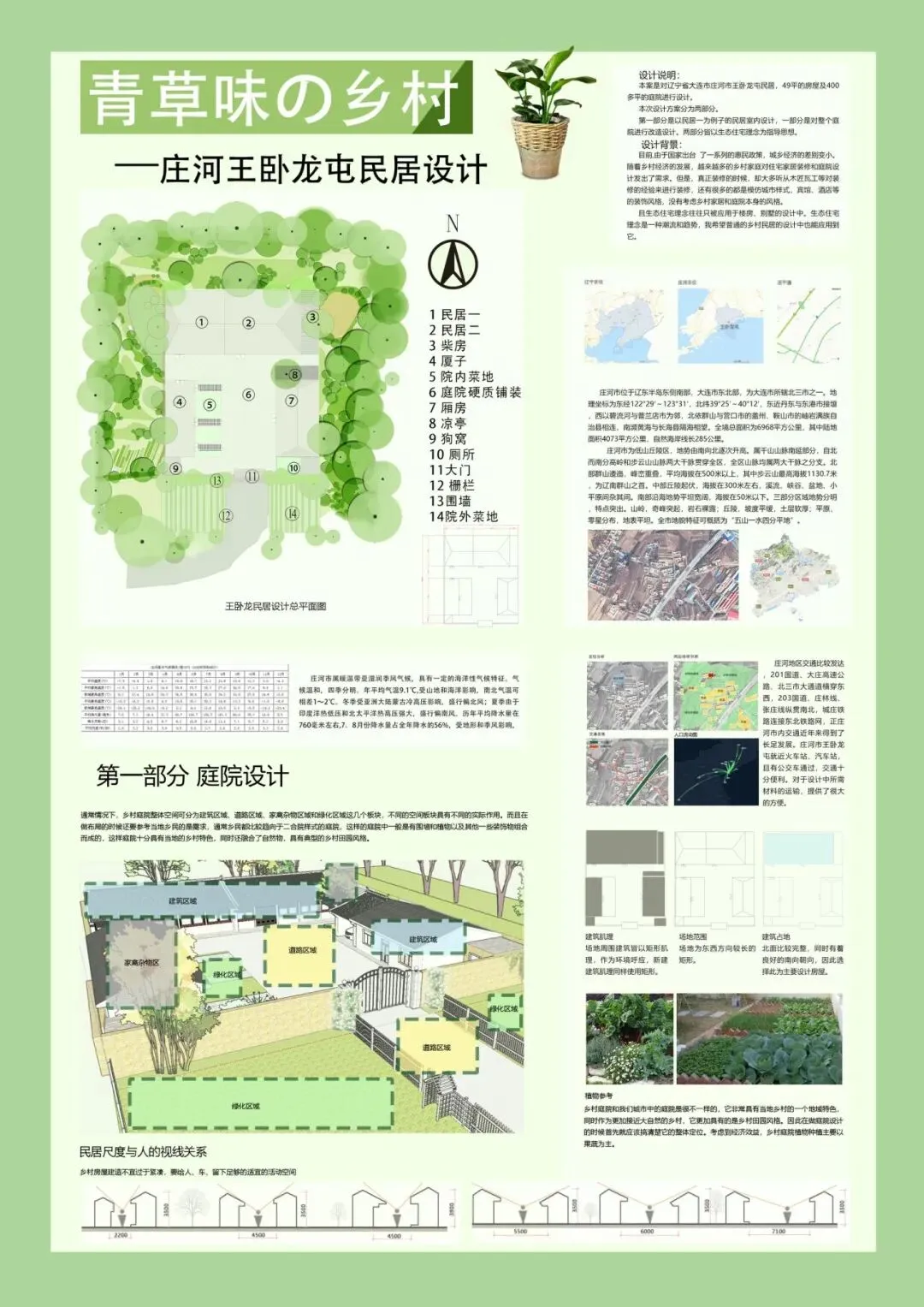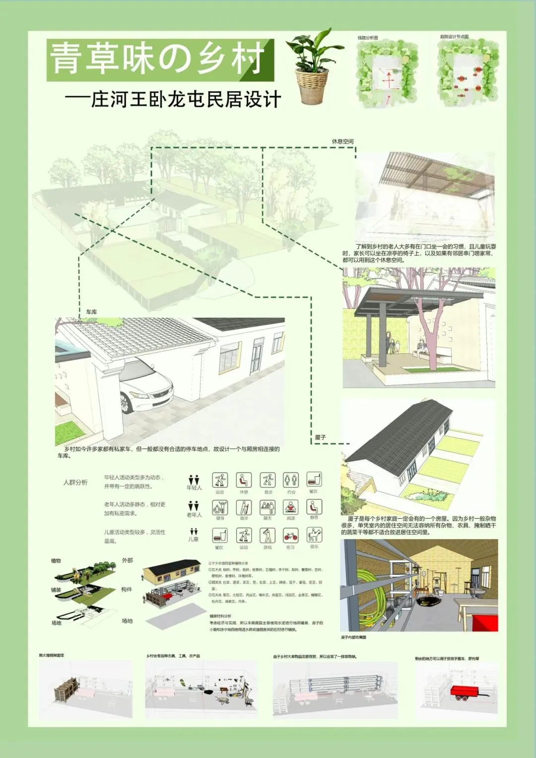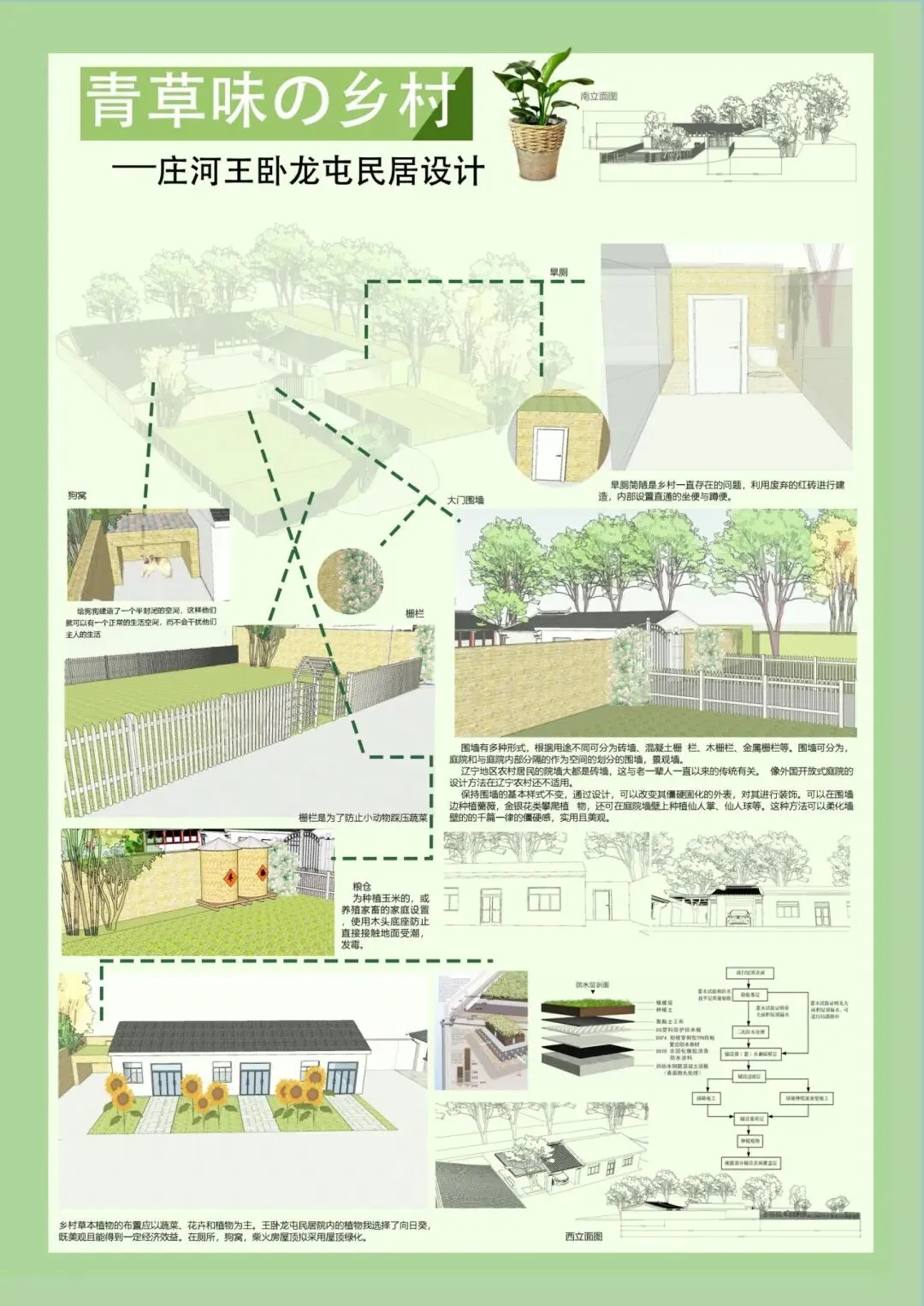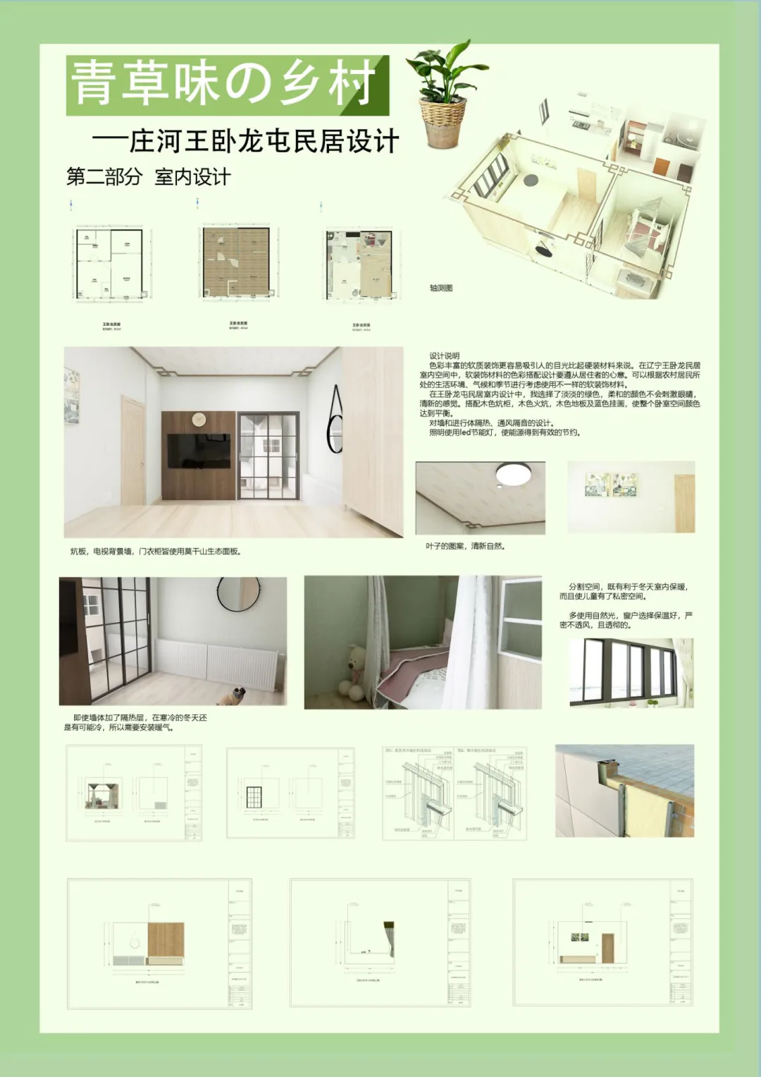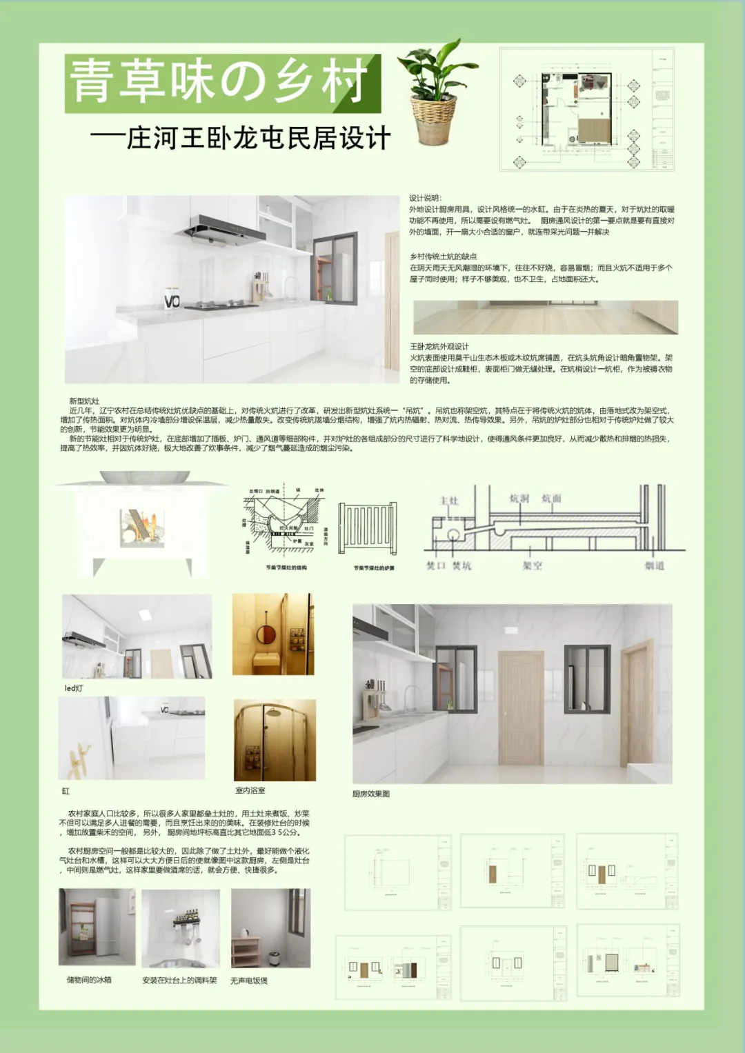 设计对辽宁省大连市庄河市王卧龙屯民居49平的房屋及400平庭院进行设计,以生态住宅的理念——生态住宅指以最节约资源减少对自然的危害的方式,处理好村民、乡村民居和生态环境三者之间的关系。生态住宅的特点就是高效、舒适、美观、健康。对北方乡村民居的共性问题,通过设计进行解决。使用莫干山生态面板对王卧龙屯民居室内空间进行全方面创新改造设计与应用,并且进行软装搭配和整体效果的创意设计。使用绿植搭配,空间规划,环境营造等方法对住宅室内外进行全方位设计。从色彩,图案,材料方面分析,对室内火炕,吊棚,厨房,储物间等进行设计。用装饰图案增加空间的丰富度,从而引起人们的注意,还能影响人们的情绪。室内颜色选择了淡淡的绿色,柔和的颜色不会刺激眼睛,清新的感觉。搭配木色炕柜,木色火炕,木色地板及蓝色挂画,使整个卧室空间颜色达到平衡。增加了室内浴室和儿童房。为了洗澡更加便捷,儿童也要有私密空间,且分隔空间利于房屋保暖。室外,由于乡村老人特有的行为,设计了凉亭。方便老人喜欢到外面坐一会的行为习惯。对旱厕进行设计,增加了直通的蹲便和坐便,改善农村厕所脏乱差的问题,方便居民的使用。部分屋顶拟使用屋顶绿化,既节约用水,又美化了环境。