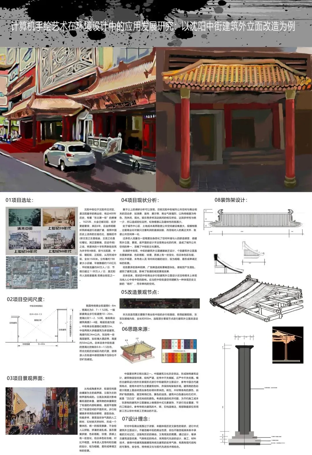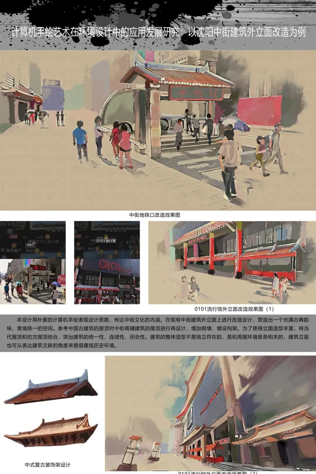 本设计针对沈阳中街商业氛围过于浓郁,未能体现历史文脉性的现状进行中式建筑外立面设计。既不能忽略中街的商业性质,也不能忽视其体系中承载的文化记忆,这既有历史的缘由,又有现实的需要。通过计算机手绘设计,继承古建筑造型优美、气势恢宏的特点,采用现代先进的设计、施工、材料技术,使得中街建筑既能展现传统古建筑的宏伟气势,具有现代结构的可靠性、安全性,将传统文化与现代先进技术相结合。