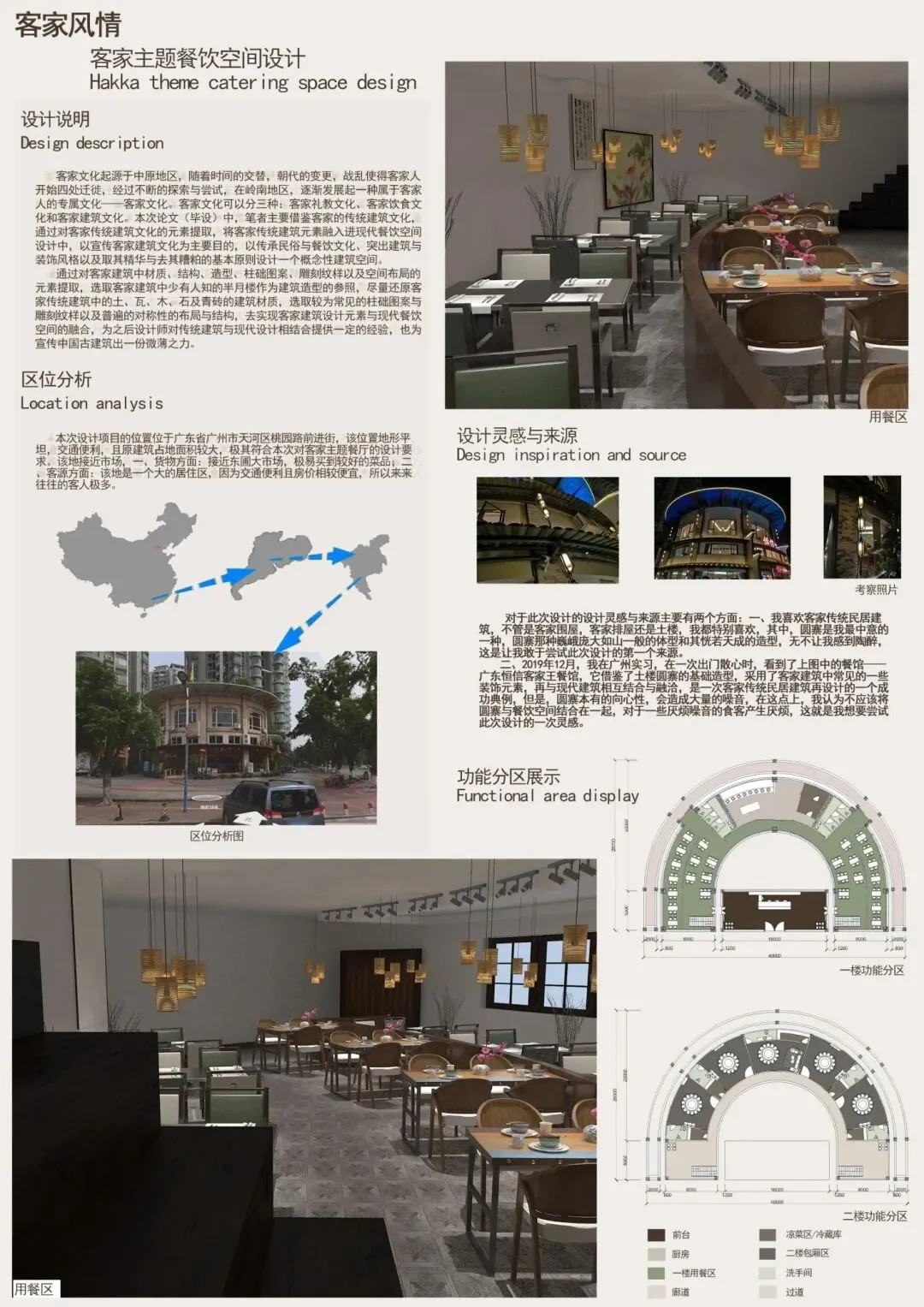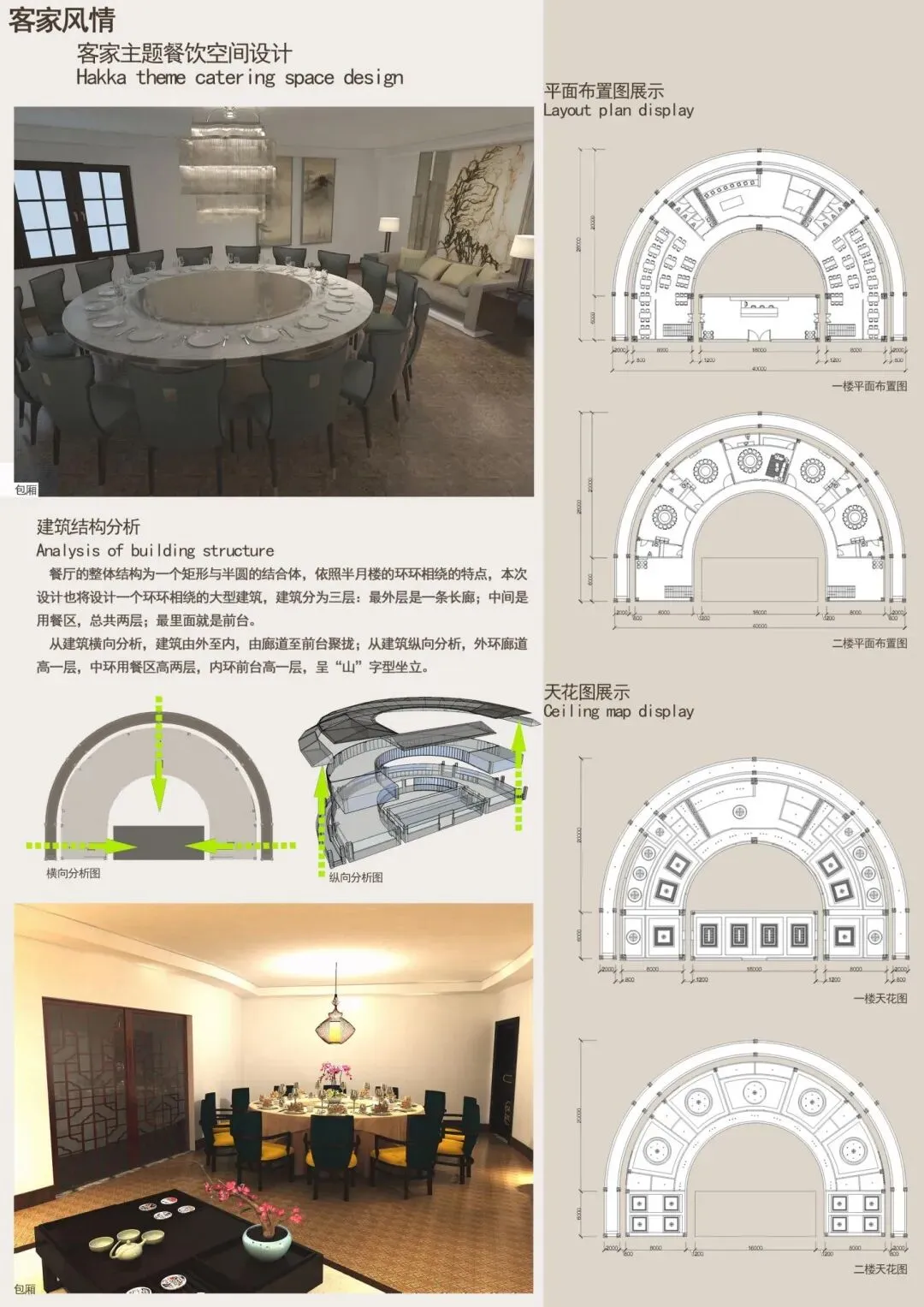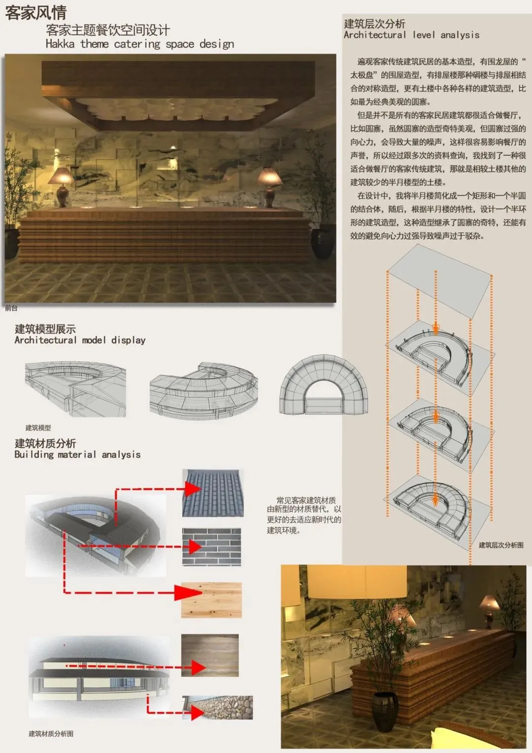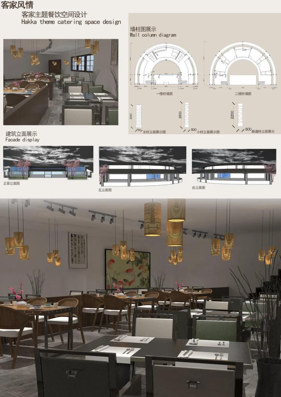 客家文化起源于中原地区,随着时间的交替,朝代的变更,战乱使得客家人开始四处迁徙,经过不断的探索与尝试,在岭南地区,逐渐发展起一种属于客家人的专属文化-客家文化。客家文化可以分三种:客家礼教文化、客家饮食文化和客家建筑文化。设计主要借鉴客家的传统建筑文化,通过对客家传统建筑文化的元素提取,将客家传统建筑元素融入进现代餐饮空间设计中,,以宣传客家建筑文化为主要目的,以传承民俗与餐饮文化、突出建筑与装饰风格以及取其精华与去其糟粕的基本原则设计一个概念性建筑空间。通过对客家建筑中材质、结构、造型、柱础图案、雕刻纹样以及空间布局的元素提取,选取客家建筑中少有人知的半月楼作为建筑造型的参照,尽量还原客家传统建筑中的土、瓦、木、石及青砖的建筑材质,选取较为常见的柱础图案与雕刻纹样以及普遍的对称性的布局与结构,去实现客家建筑设计元素与现代餐饮空间的融合,为之后设计师对传统建筑与现代设计相结合提供一定的经验,也为宣传中国古建筑出一份微薄之力。