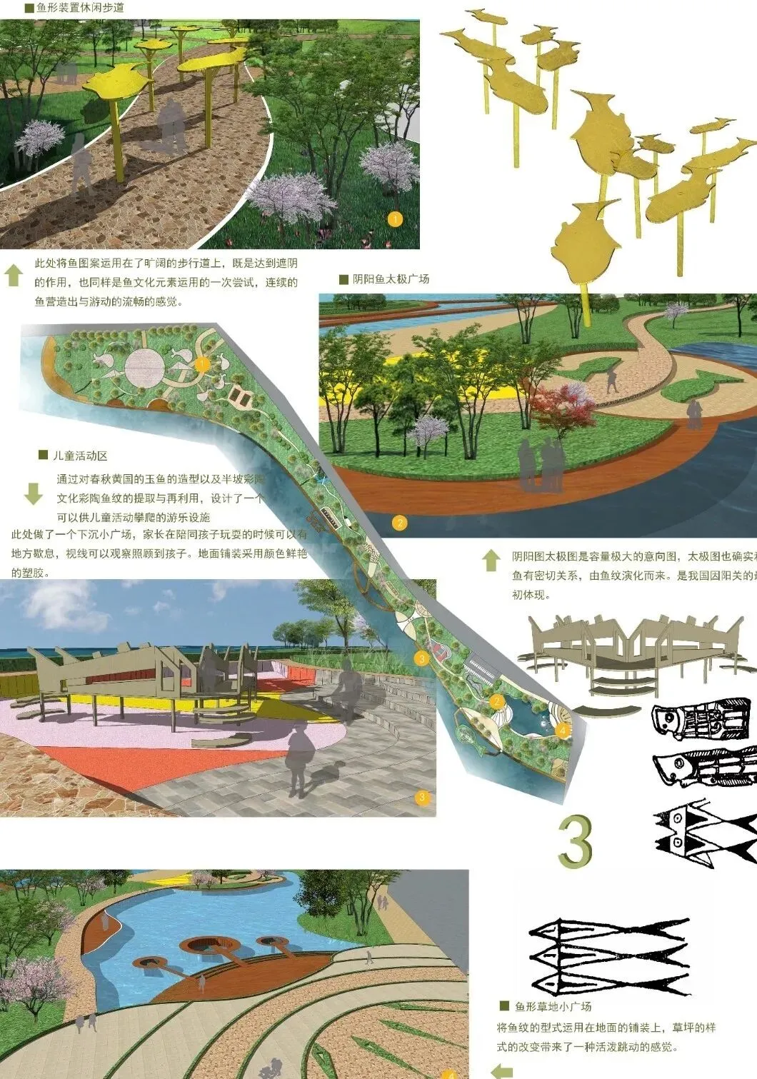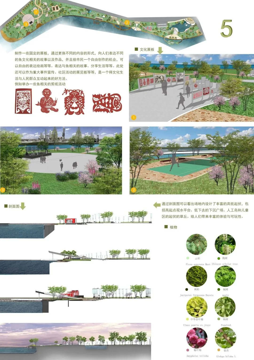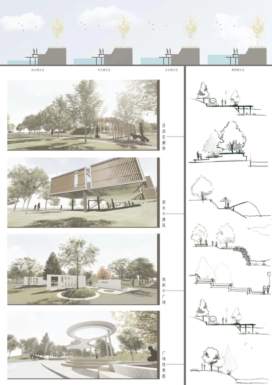 通过对现场的考察调研,发现其有许多的不足,例如功能分区不合理、场地设施陈旧破顺、线路规划不合理等。但最主要的问题是洪峰期河流对场地的影响。当地夏季降水短促急速,暴雨会使得场地尤其是使用率最高的圆形广场丧失使用功能。设计从横纵向两个层次出发,横向上将空间划分为生态区、活动区、文化区;纵向上将场地划分为四个不同高度的平台,最高的与堤坝顶部同高(6.8m),最低处贴近平时的河水水平面。使场地在不同时期都可以被充分利用。场地的造型肌理上,即参考了周边的长方体样式为主的建筑群,又添加了灵活性较佳的曲线。用硬质铺装与绿化铺装间隔式排列,为空间场地的创造性提供更多的可能。原有的公园东西两侧占地面积差距较大,整体向西侧倾斜,但是西侧场地利用率远远低于其他部分,在场地的整体外形上,将两侧的场地面积进行调整,并且增加其功能性,来吸引游客。本次设计另一特点就是将原有联系并不明显的路面景观与水面景观结合,将设计延伸到河面上,并且将中心原有的条带状岛屿赋予活动性质的功能。