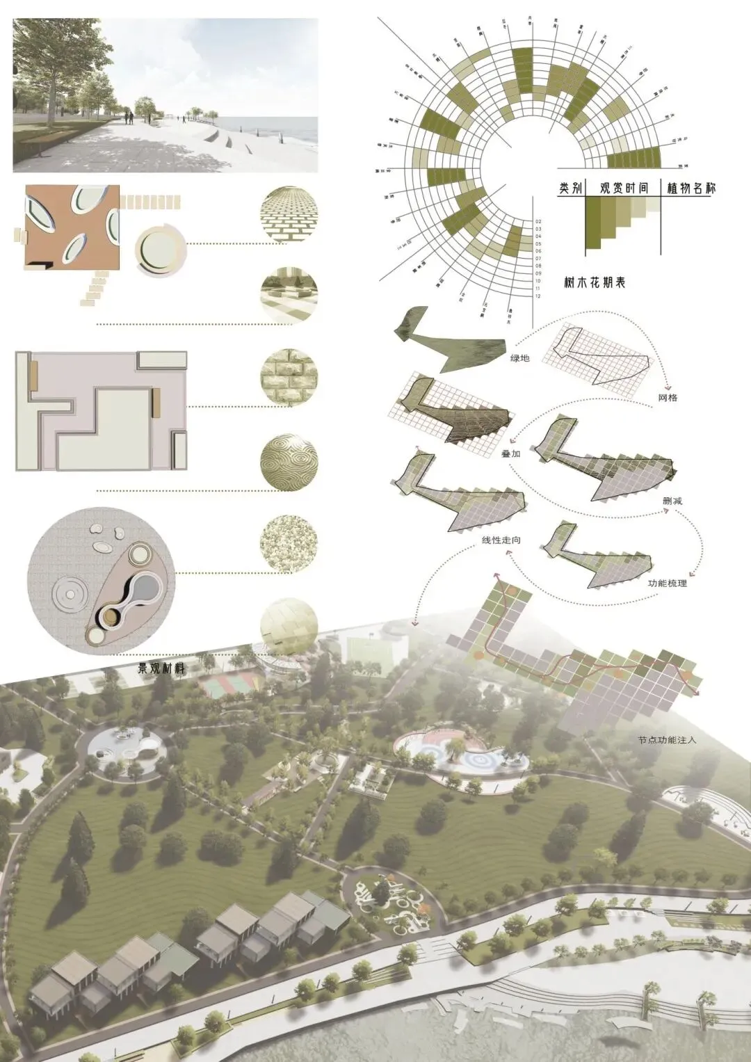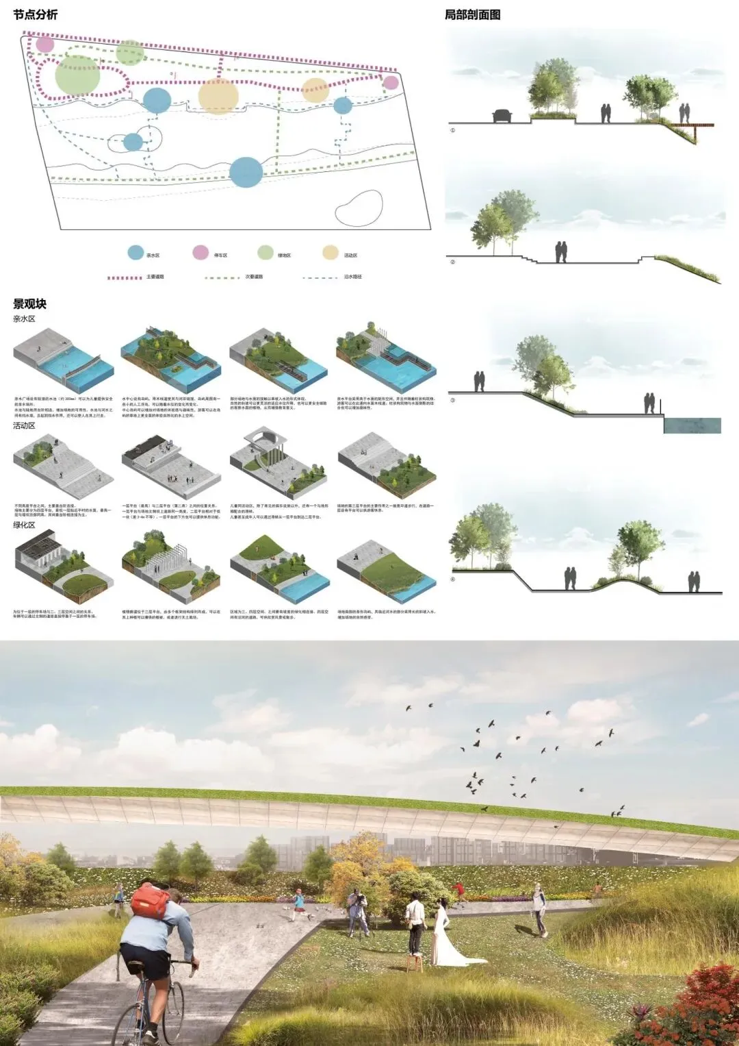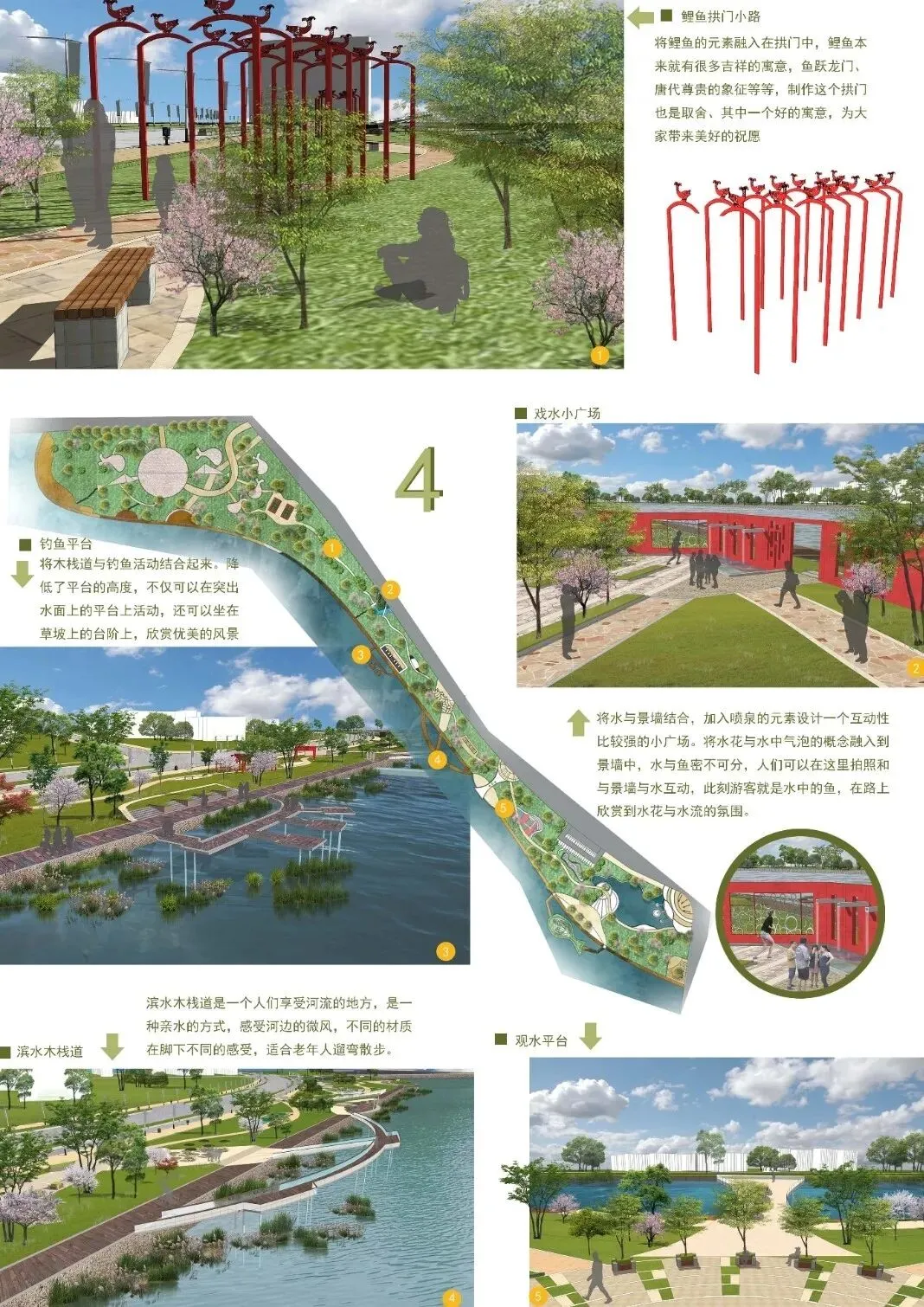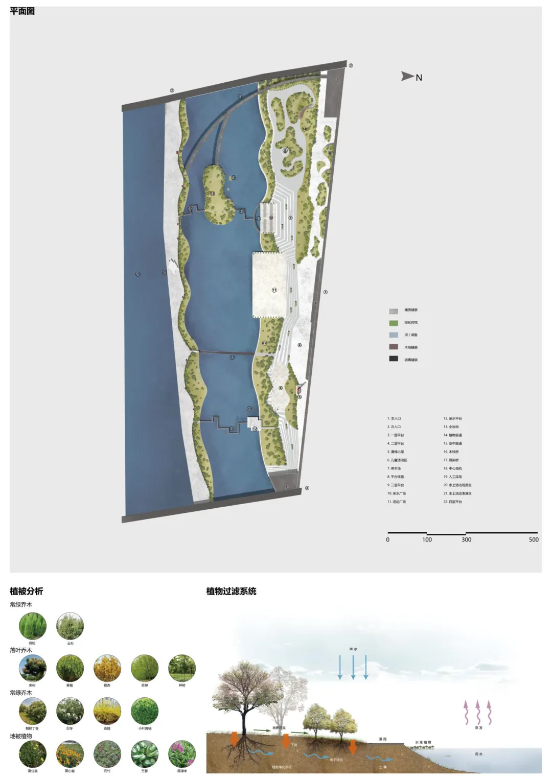 通过对现场的考察调研,发现其有许多的不足,例如功能分区不合理、场地设施陈旧破顺、线路规划不合理等。但最主要的问题是洪峰期河流对场地的影响。当地夏季降水短促急速,暴雨会使得场地尤其是使用率最高的圆形广场丧失使用功能。设计从横纵向两个层次出发,横向上将空间划分为生态区、活动区、文化区;纵向上将场地划分为四个不同高度的平台,最高的与堤坝顶部同高(6.8m),最低处贴近平时的河水水平面。使场地在不同时期都可以被充分利用。场地的造型肌理上,即参考了周边的长方体样式为主的建筑群,又添加了灵活性较佳的曲线。用硬质铺装与绿化铺装间隔式排列,为空间场地的创造性提供更多的可能。原有的公园东西两侧占地面积差距较大,整体向西侧倾斜,但是西侧场地利用率远远低于其他部分,在场地的整体外形上,将两侧的场地面积进行调整,并且增加其功能性,来吸引游客。本次设计另一特点就是将原有联系并不明显的路面景观与水面景观结合,将设计延伸到河面上,并且将中心原有的条带状岛屿赋予活动性质的功能。