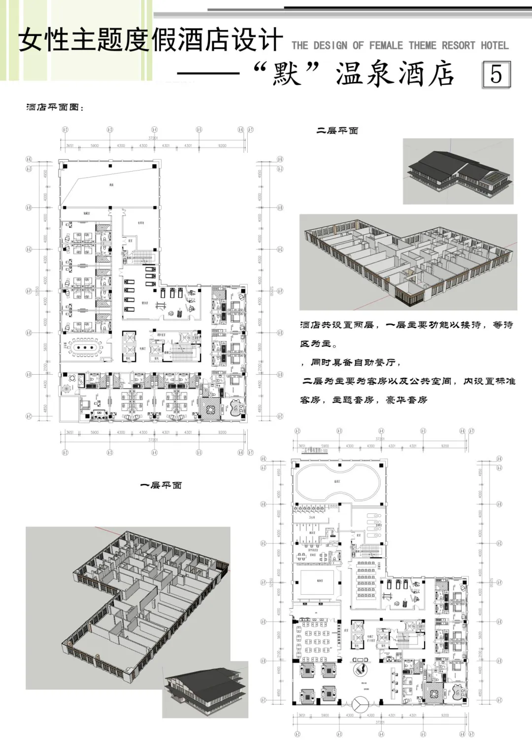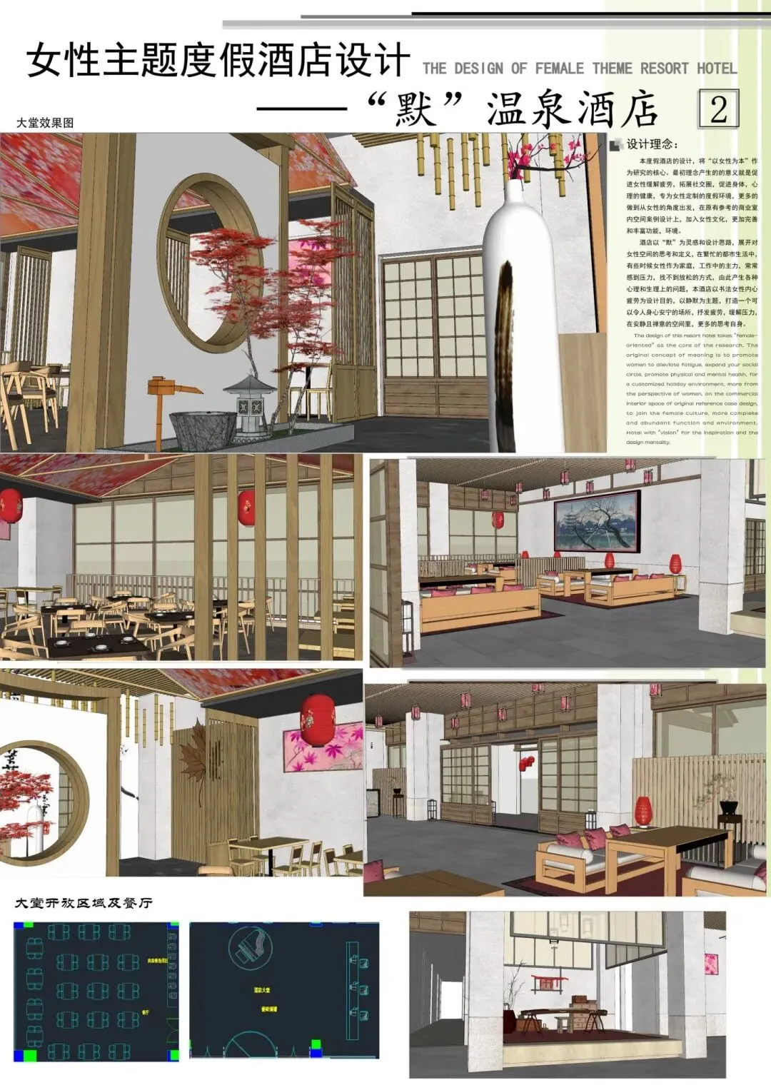 随着经济社会的发展和人类文明的进步,女性的社会地位已经同以往大大不同,女权主义也愈演愈烈,女性也逐渐成为消费市场的主体,许多商业场所为了迎合女性消费者,在空间设计上也十分注重女性的情感体验,久而久之产生了许多以女性消费者为主导的商业空间。本度假酒店的设计,将“以女性为本”作为研究的核心。最初理念产生的的意义就是促进女性缓解疲劳,拓展社交圈,促进身体,心理的健康,专为女性定制的度假环境,更多的做到从女性的角度出发,在原有参考的商业室内空间案例设计上,加入女性文化,更加完善和丰富功能,环境。酒店以“默”为灵感和设计思路,展开对女性空间的思考和定义,在繁忙的都市生活中,有些时候女性作为家庭,工作中的主力,常常感到压力,找不到放松的方式,由此产生各种心理和生理上的问题,本酒店以书法女性内心疲劳为设计目的,以静默为主题,打造一个可以令人身心安宁的场所,抒发疲劳,缓解压力,在安静且禅意的空间里,更多的思考自身。