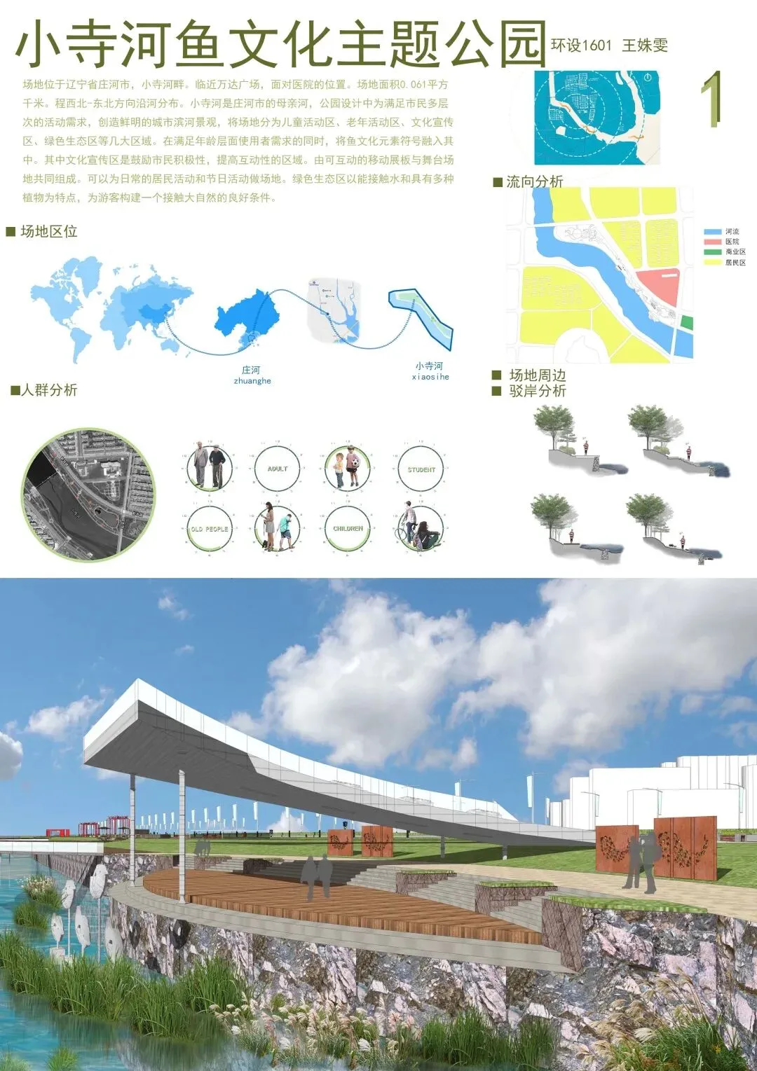 场地位于辽宁省庄河市小寺河畔,临近万达广场,面对医院的位置,场地面积0.061平方千米。呈西北-东北方向沿河分布。小寺河是庄河市的母亲河,公园设计中为满足市民多层次的活动需求,创造鲜明的城市滨河景观,将场地分为儿童活动区、老年活动区、文化宣传区、绿色生态区等几大区域。在满足年龄层面使用者需求的同时,将鱼文化元素符号融入其中。其中文化宣传区是鼓励市民积极性,提高互动性的区域。由可互动的移动展板与舞台场地共同组成。可以为日常的居民活动和节日活动做场地。绿色生态区以能接触水和具有多种植物为特点,为游客构建一个接触大自然的良好条件。