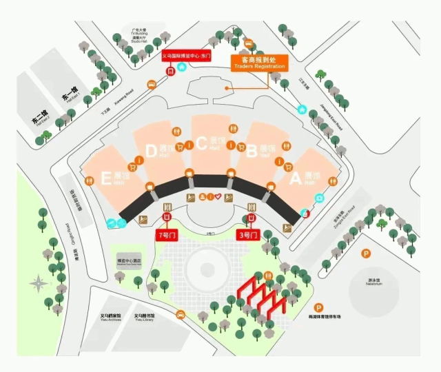 为方便停车,请导航至义乌梅湖体育馆停车场,后步行至义乌国际博览中心进口。
