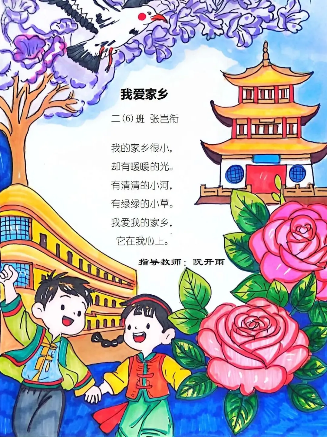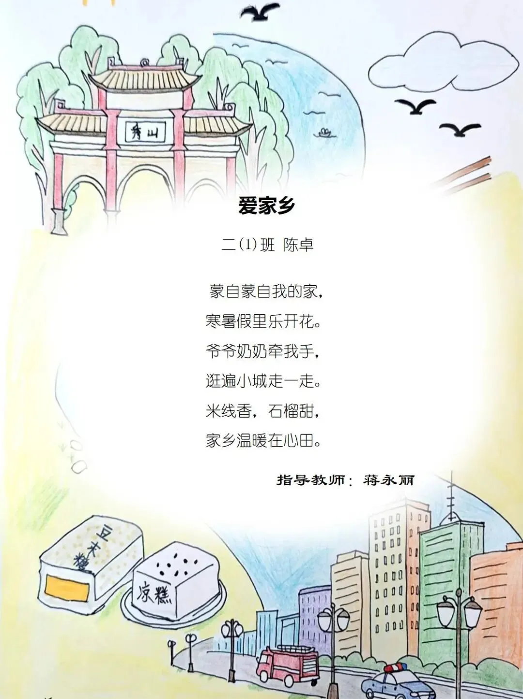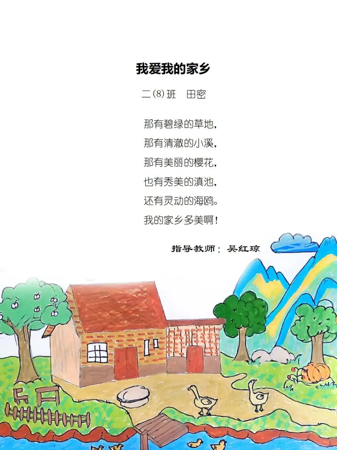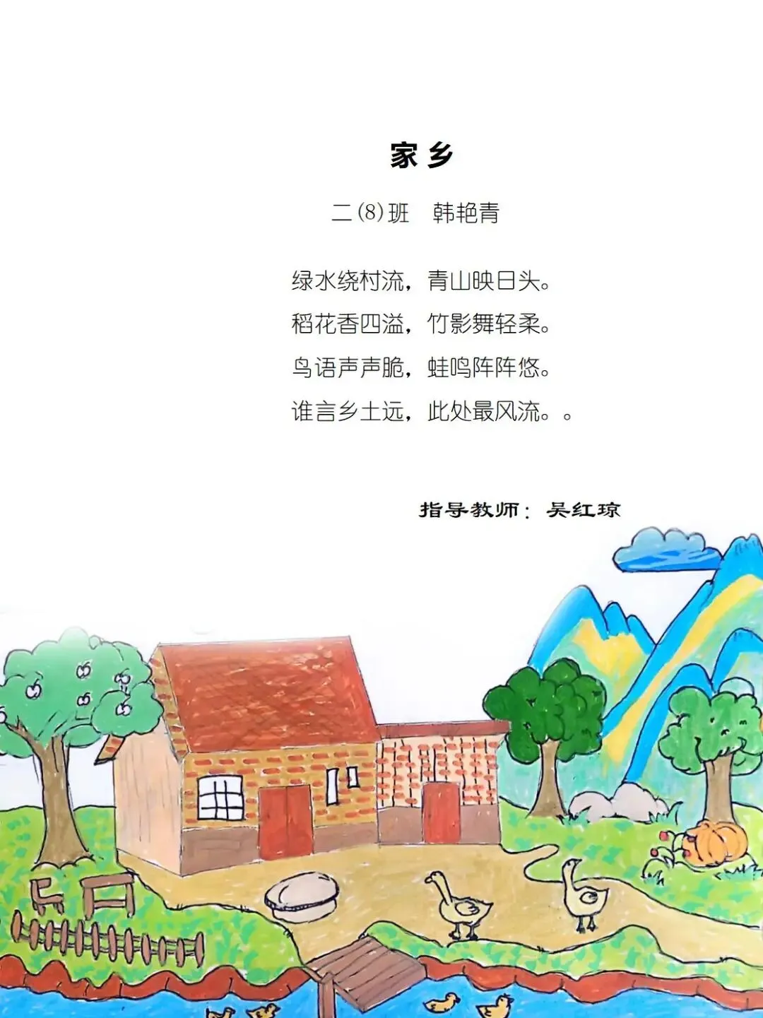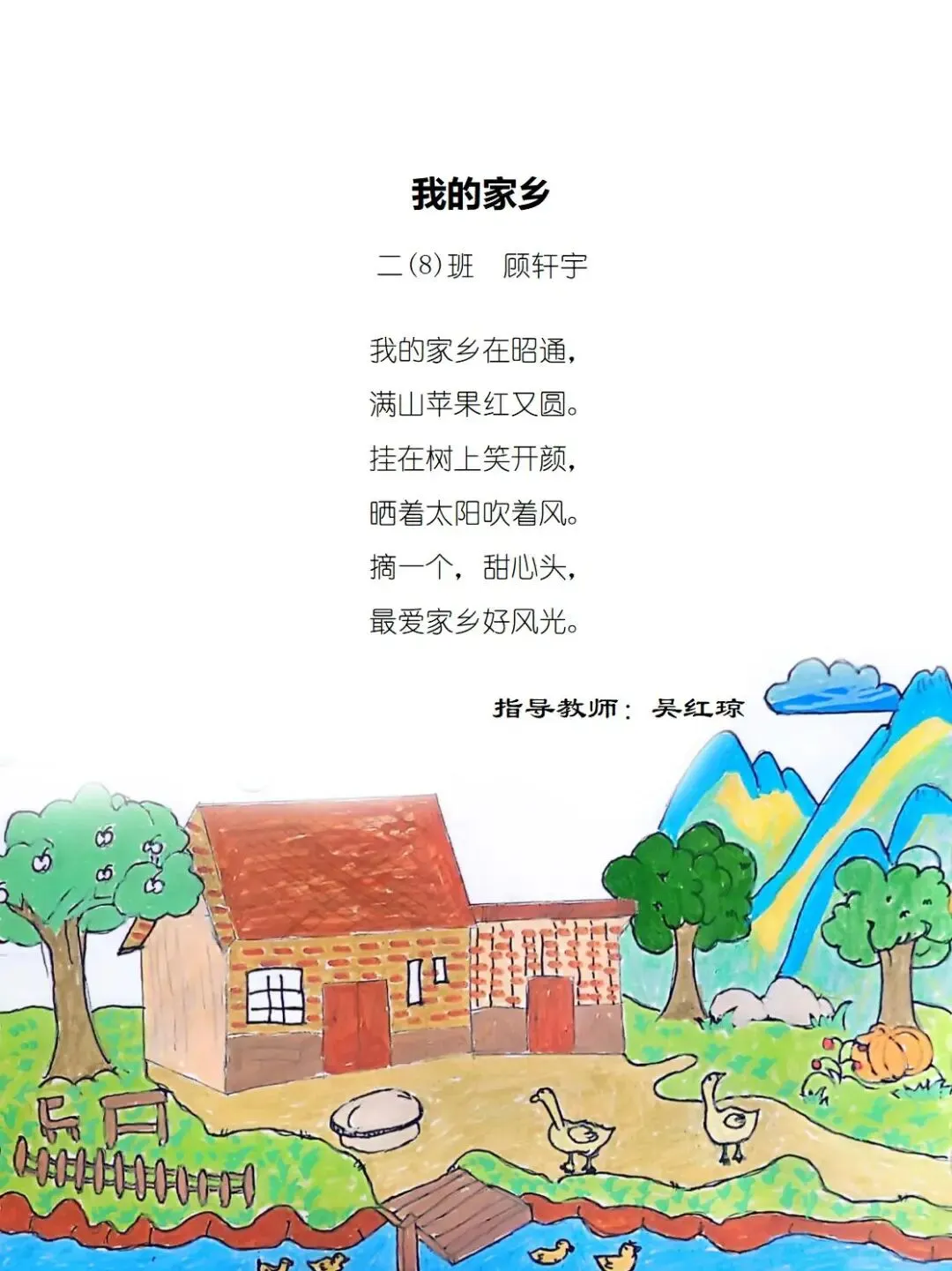 二年级的孩童们,以稚笔描摹山河,以童心拥抱故土,将目之所及的乡野风光、耳之所闻的乡音民俗,凝作笔尖流转的温情。那缕袅袅炊烟,是故乡温柔的牵挂;那片青青田野,是大地馈赠的诗行;那句淳朴乡音,是血脉相连的牵挂。这些藏在时光里的乡土美好,皆化作诗行间的星光,点亮独属于童年的家国情怀,也让中华民族一家亲的种子,在纸页间静静扎根,向阳生长。