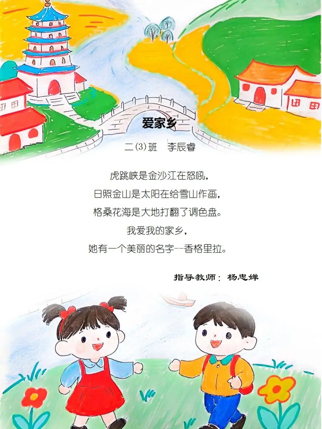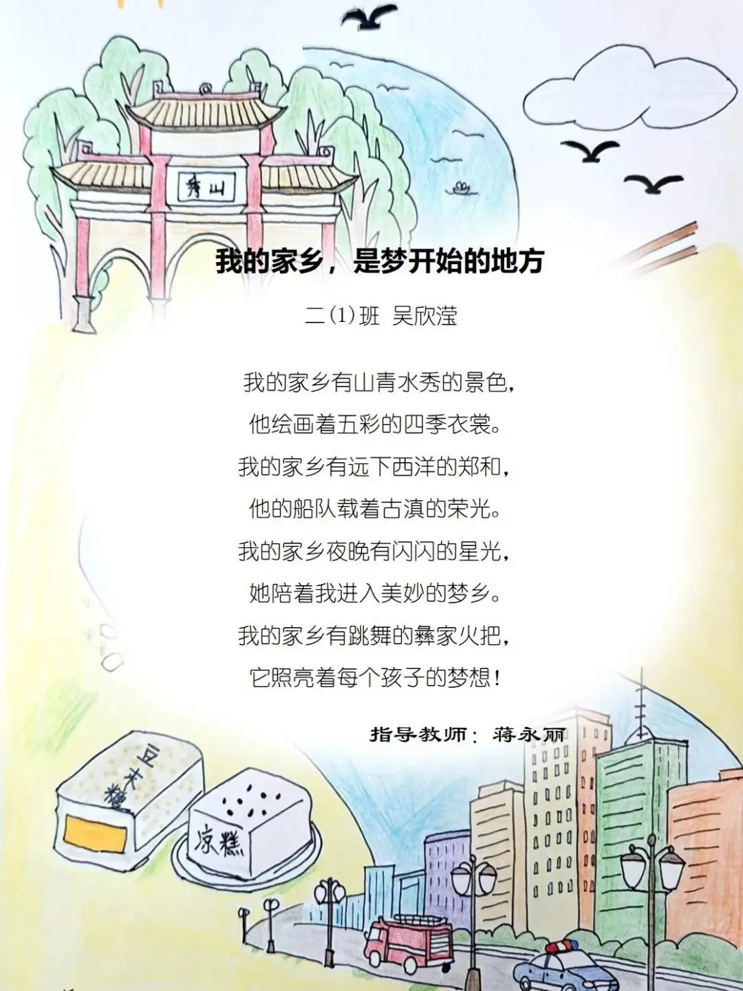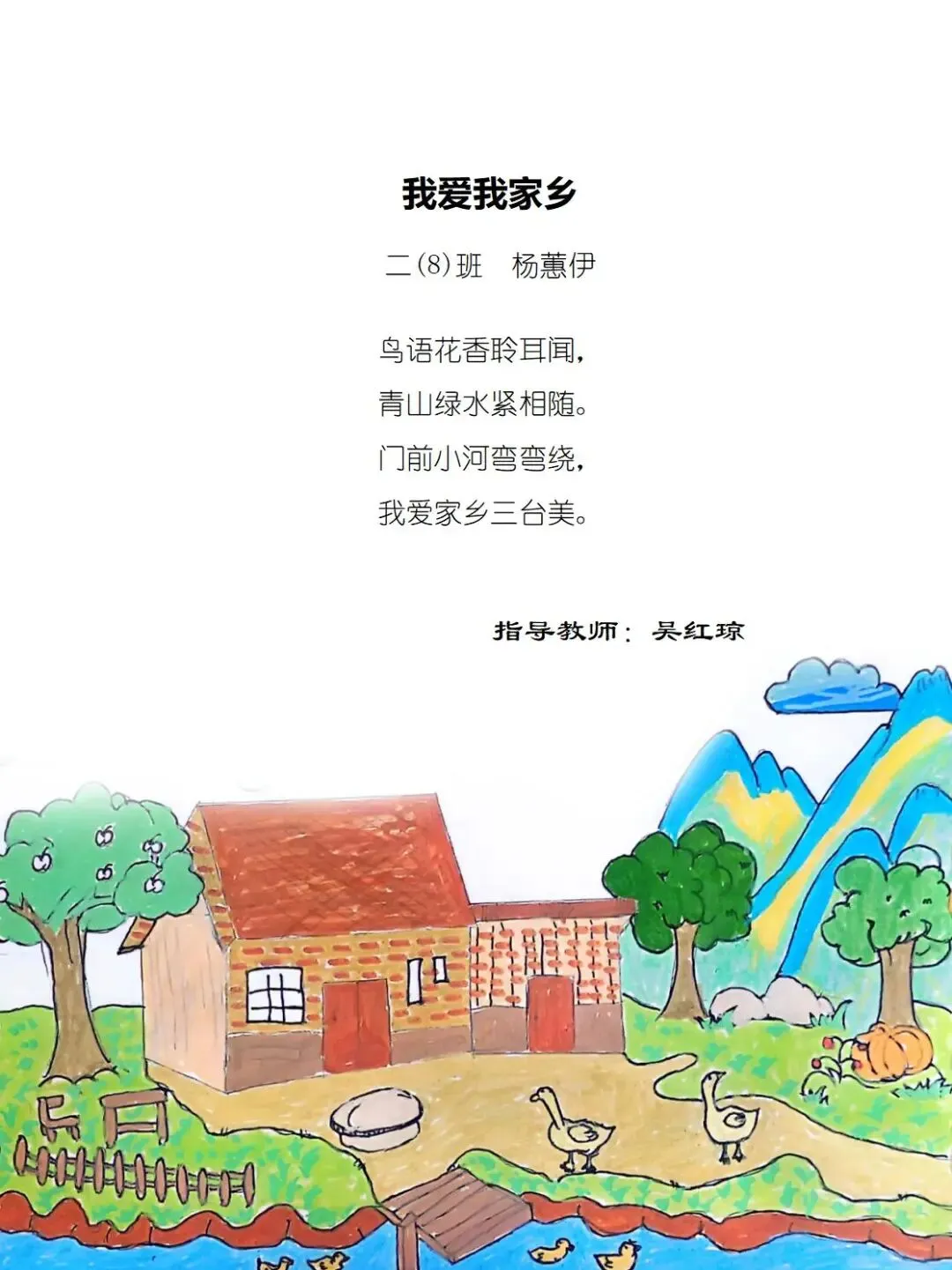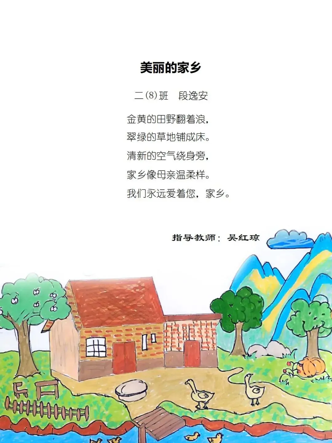 二年级的孩童们,以稚笔描摹山河,以童心拥抱故土,将目之所及的乡野风光、耳之所闻的乡音民俗,凝作笔尖流转的温情。那缕袅袅炊烟,是故乡温柔的牵挂;那片青青田野,是大地馈赠的诗行;那句淳朴乡音,是血脉相连的牵挂。这些藏在时光里的乡土美好,皆化作诗行间的星光,点亮独属于童年的家国情怀,也让中华民族一家亲的种子,在纸页间静静扎根,向阳生长。