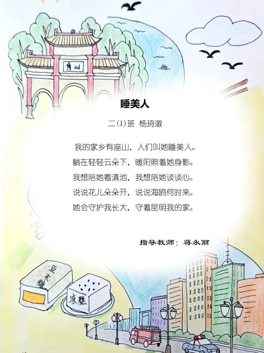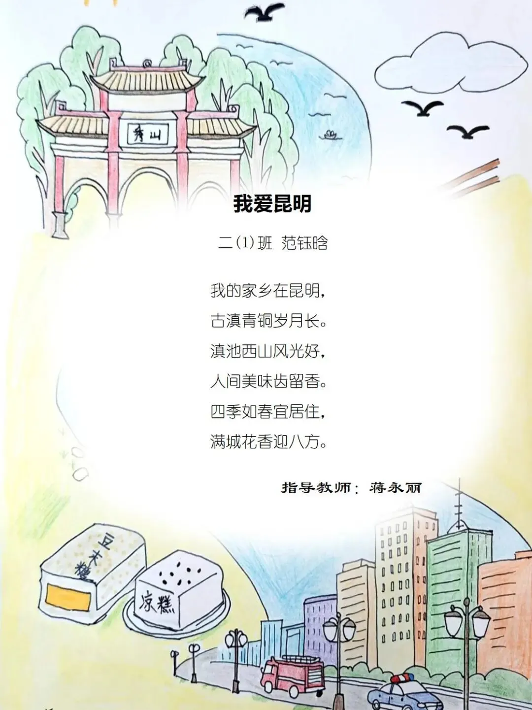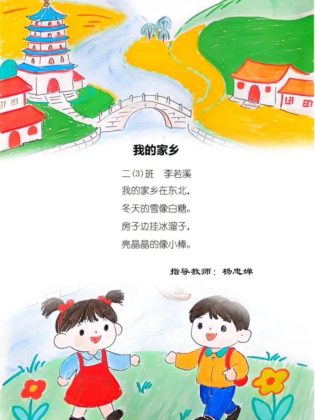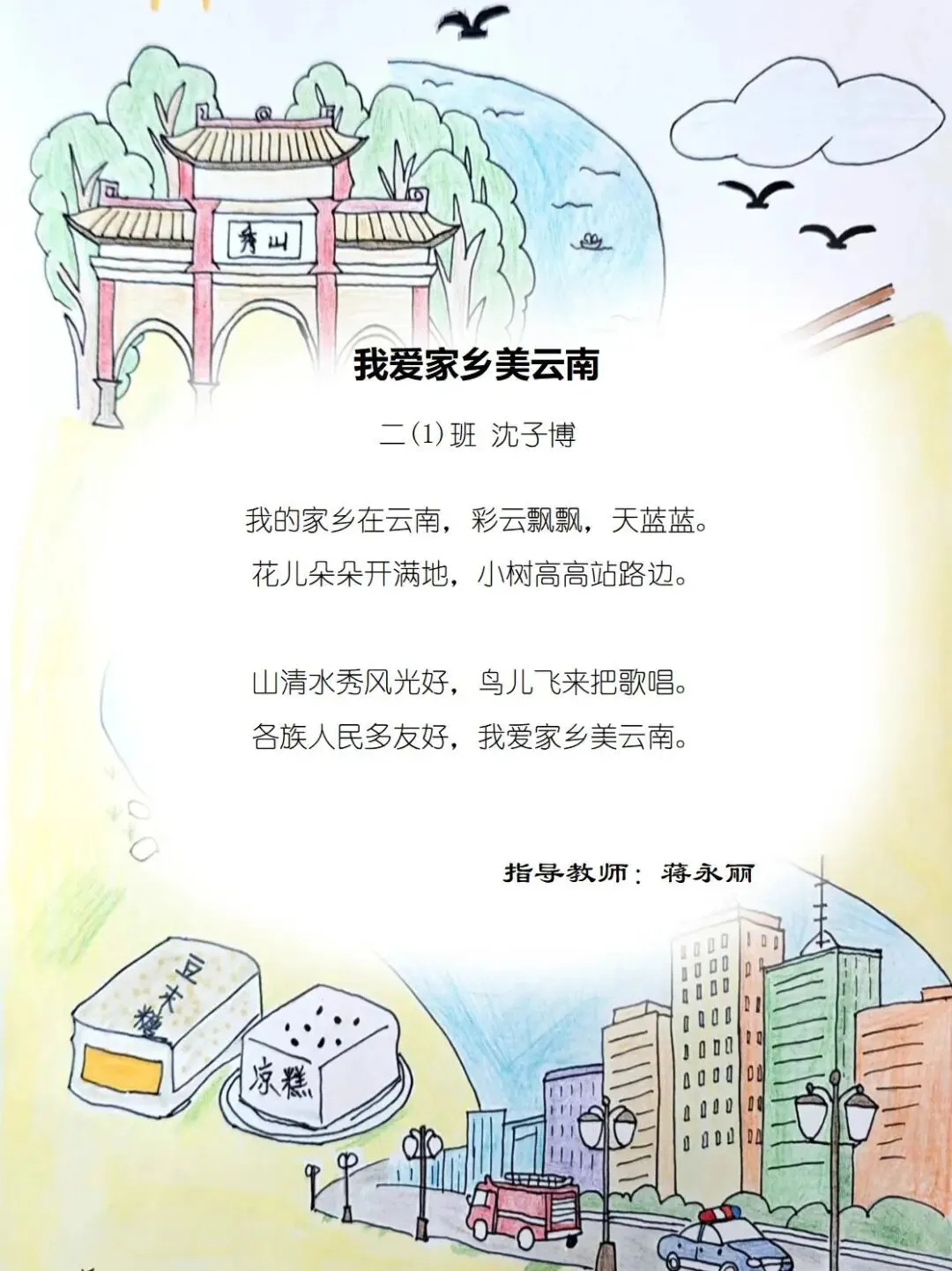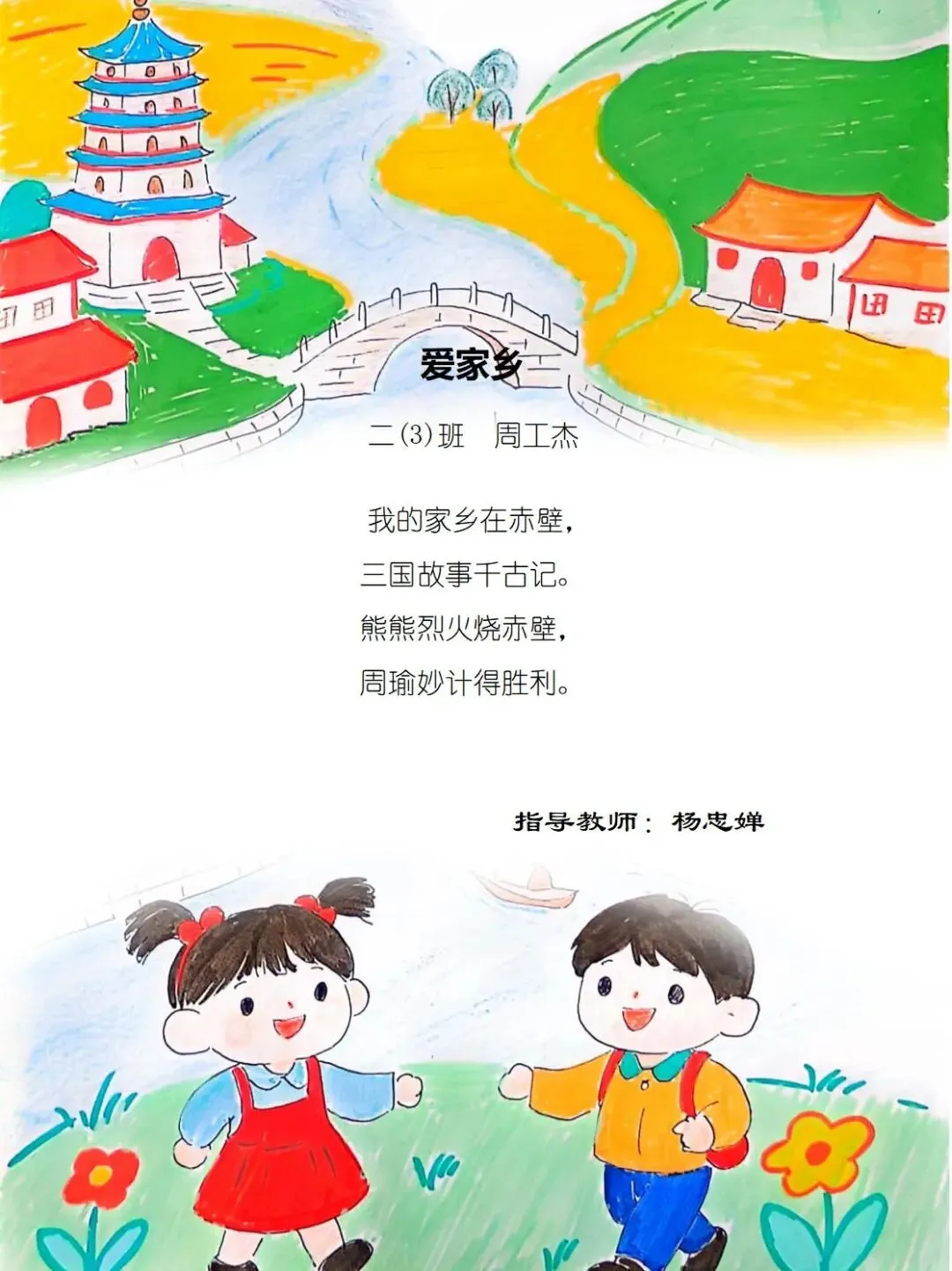 二年级的孩童们,以稚笔描摹山河,以童心拥抱故土,将目之所及的乡野风光、耳之所闻的乡音民俗,凝作笔尖流转的温情。那缕袅袅炊烟,是故乡温柔的牵挂;那片青青田野,是大地馈赠的诗行;那句淳朴乡音,是血脉相连的牵挂。这些藏在时光里的乡土美好,皆化作诗行间的星光,点亮独属于童年的家国情怀,也让中华民族一家亲的种子,在纸页间静静扎根,向阳生长。