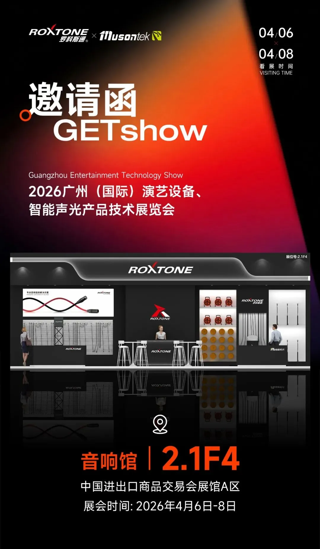 我司将于4月06日-08日参加2026年广州(国际)演艺设备、智能声光产品技术展览会 GETshow,届时立腾科技将携旗下两大品牌Roxtone & Musontek重磅亮相!本次展会,我司将展出各类音视频接插件、基座、DI盒、音频隔离器、麦克风线、连接器、拓展设备、谱架、支架等音视频配件。展位位于2.1 音响馆 2.1F4,诚邀各位新老客户、业界同仁莅临现场,指导参观!