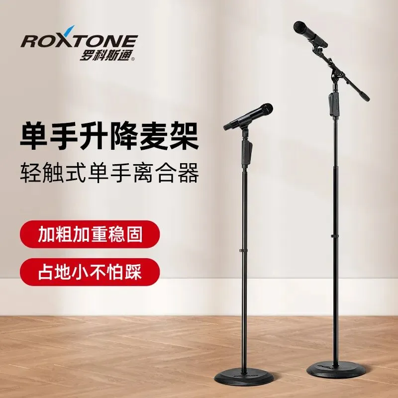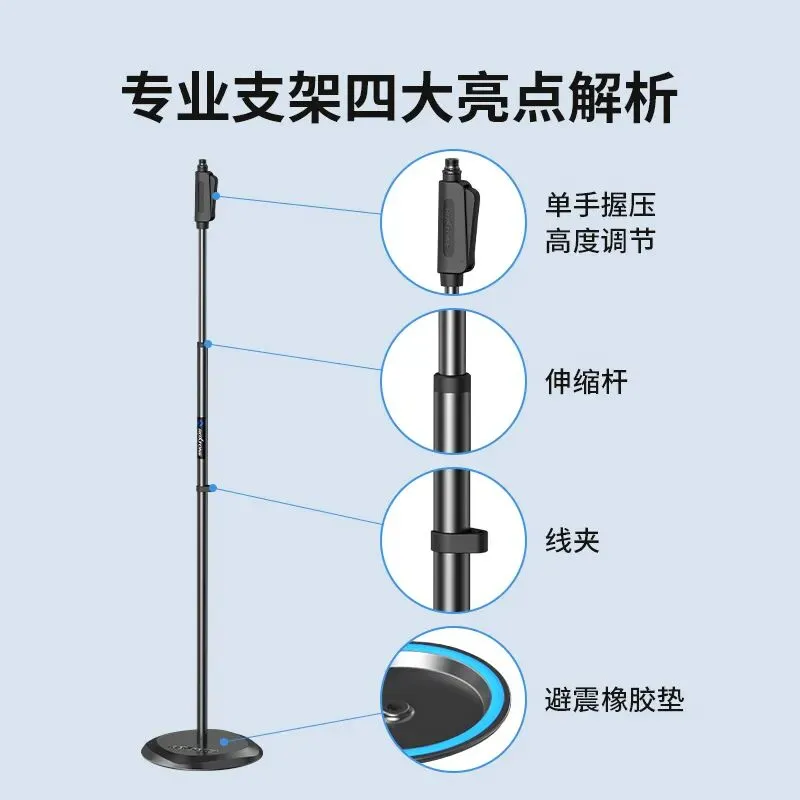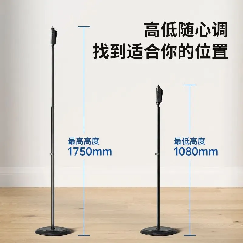 圆盘落地式麦克风支架:搭载轻触式单手离合器,可实现快速升降调节;3.5kg实心菱形切面圆形铸铁底座,承重稳固、稳如磐石,适配各类演出场景需求。