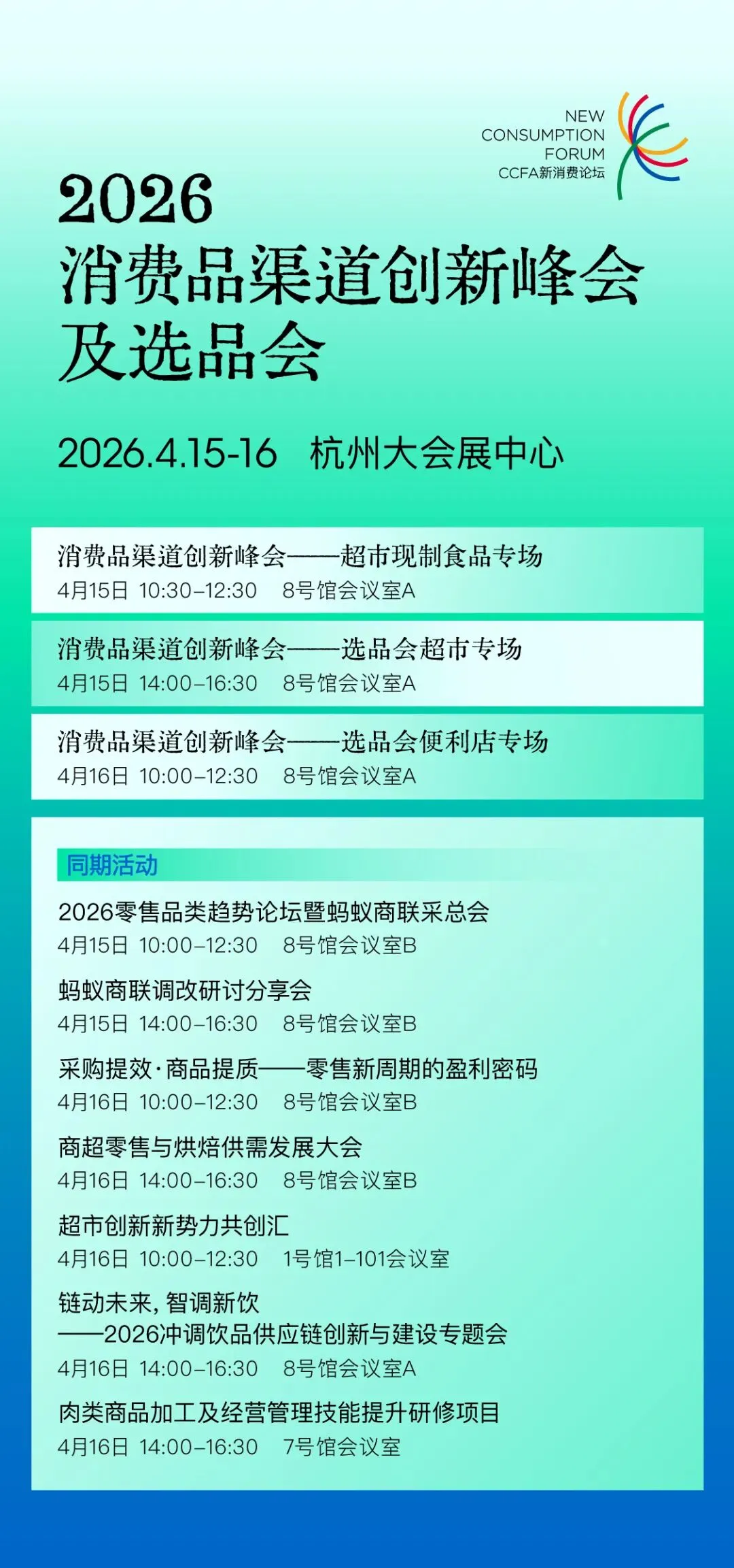 消费品渠道创新峰会及选品会:会议以“趋势发布+精准对接+实战赋能”为内核,为零售渠道采购负责人与优质商品供应商打造优质选品与交流对接平台。今年,会议设置超市现制食品专场、超市专场、便利店专场三大专场,现场将精准发布选品需求、准入标准及合作模式,主创团队将深度解读《超市现场制售食品发展现状及发展路径研究报告》,还有来自家家悦、信誉楼、天虹、郑兆丰的负责人进行案例分享。同期活动互为势能,共同搭建零供双方高效对接的直连桥梁。