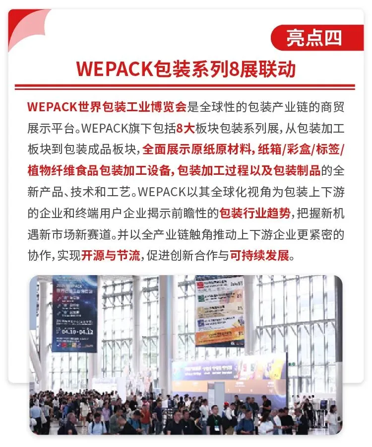PACKCON以行业维度进行划分,特设八大创新展区。除了食品饮料酒类、餐饮外卖、电商物流、电子制造、汽车工业运输等核心板块,PACKCON全新推出“定制化包装制品展区”、“新材料包装展区”和“宠物食品展区”。这三大展区紧扣高速增长的柔性包装供应链技术需求、新材料与宠物经