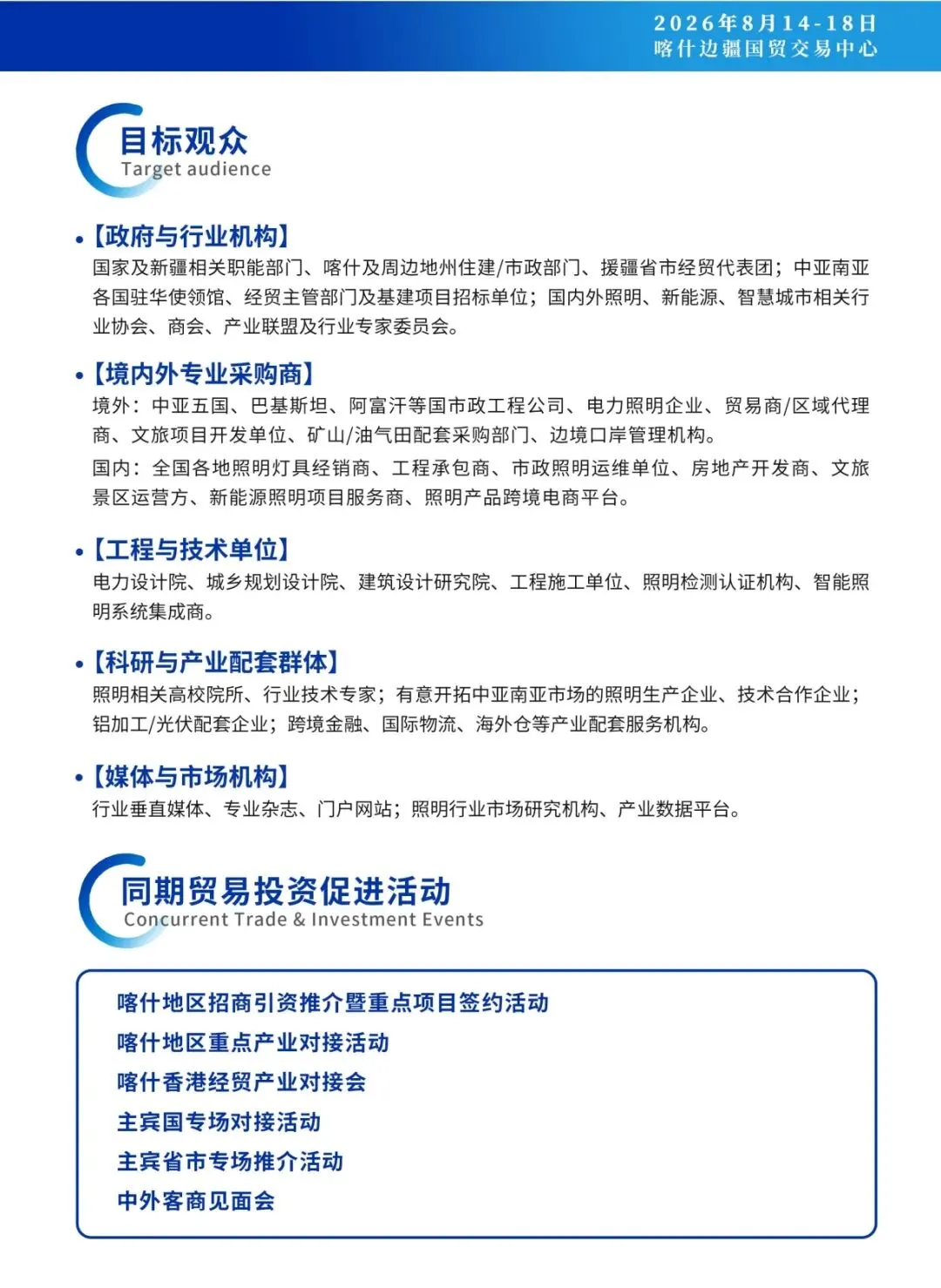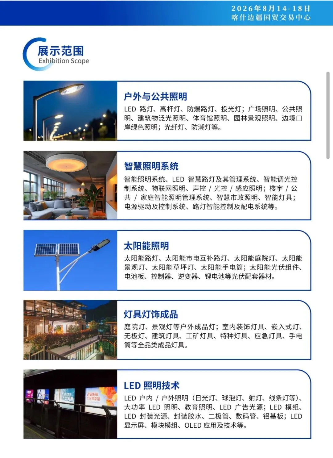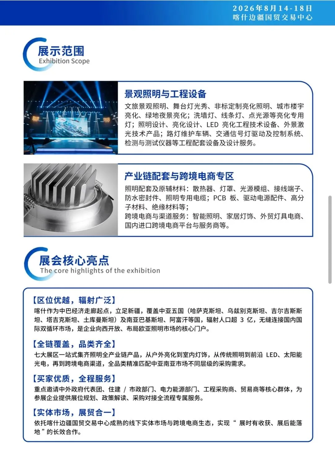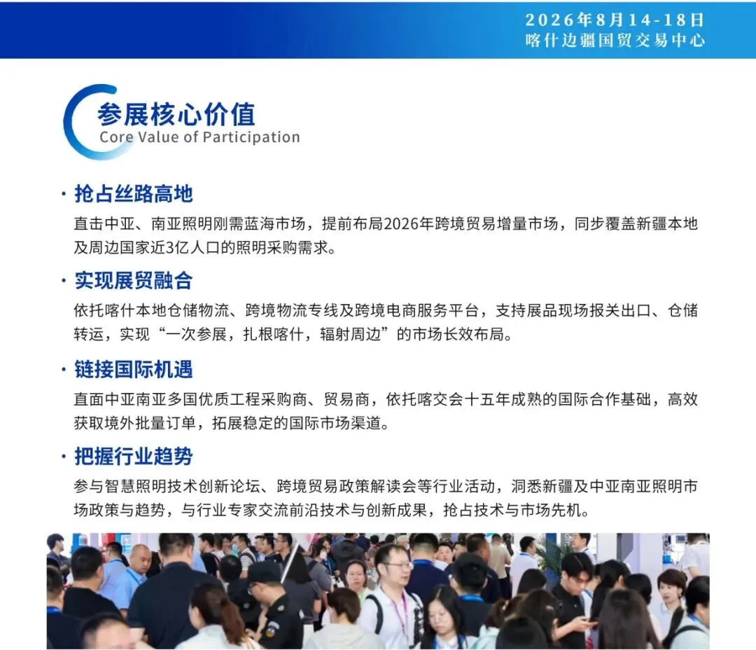 2026"喀交会 "照明展览会,不仅是企业展示的舞台,更是链接中亚、南亚市场的核心门户。现诚挚邀请全球照明产业界同仁共聚喀什,以照明产业之力,共同助推亚欧黄金通道建设,共拓中亚、南亚照明市场新机遇!
