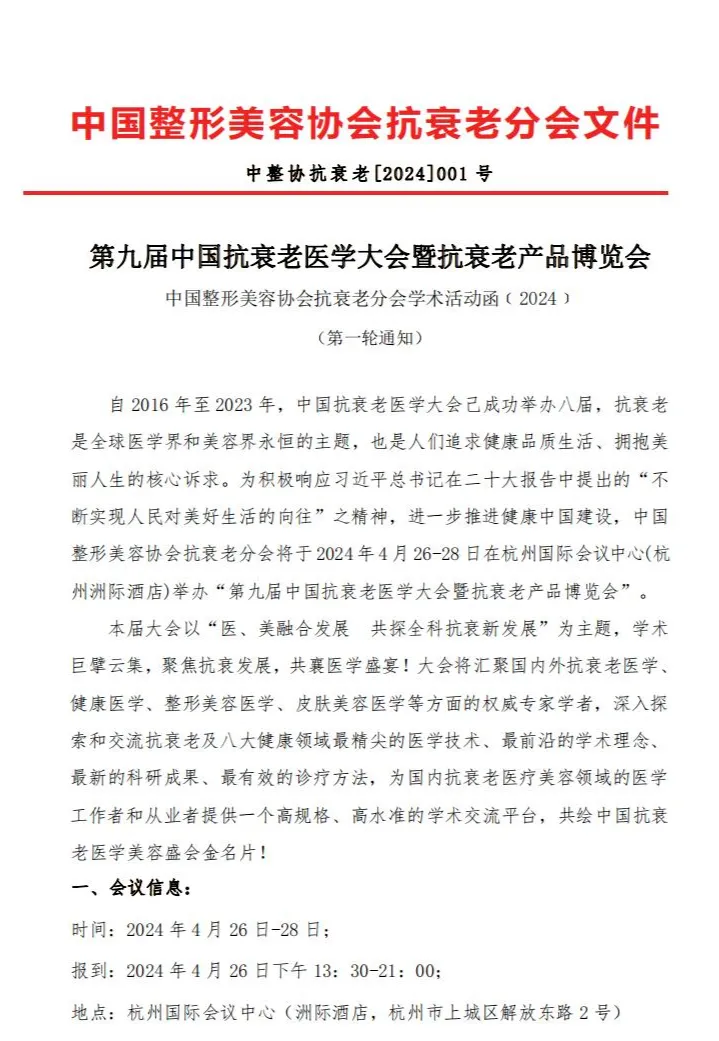 本次"第九届中国抗衰老医学大会暨抗衰老产品博览会"以"医、美融合发展,共探全科抗衰新发展"为主题,围绕抗衰老系统医学的九大维度,以生物科技为根本,结合学术技术、美学设计、经典技术和学术热点等,交流主题特色鲜明、内容丰富、精彩纷呈,数百场融合学术技术、科学艺术、运营管理等最新理念的精品讲座期待您的到来。