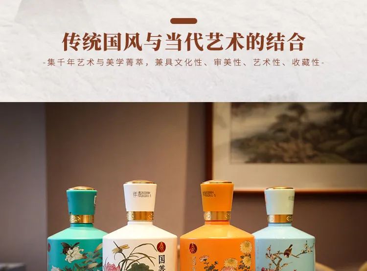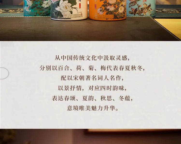大气礼盒包装,传统国风与当代艺术的结合,百合;荷花;菊花;梅花,图案活灵活现,饱含传统文化吉祥寓意,既是好酒又是艺术珍藏品!