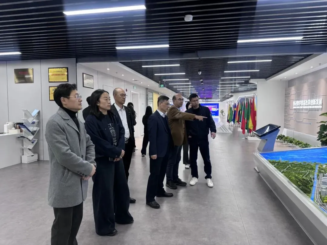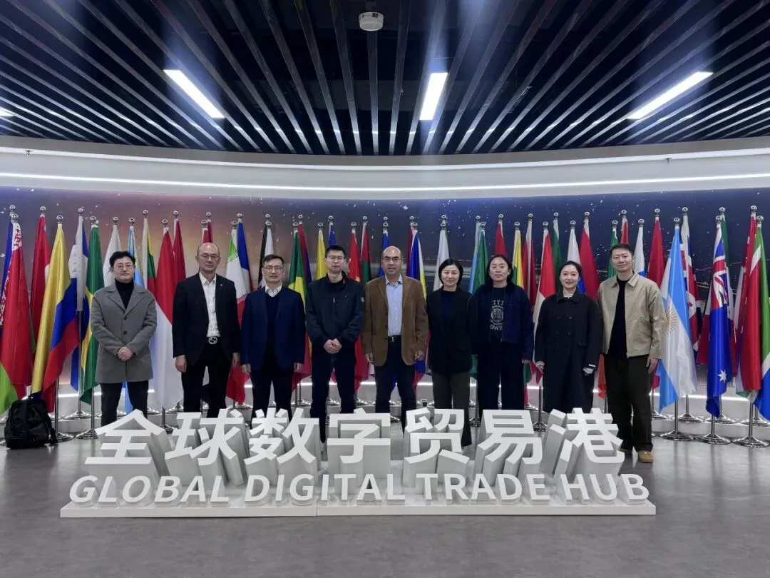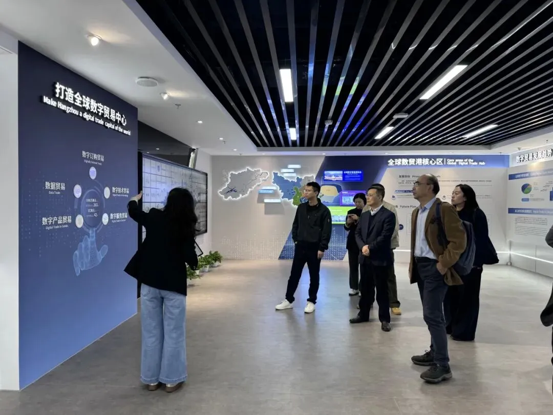 随后,学院团队前往全球数字贸易创新港展厅进行参观。全球数贸创新港规划以“会展+数贸”双轮驱动模式,大力发展数字贸易产业,聚焦数字技术、数字产品、数字服务、数据交易、跨境电商等数字贸易领域,形成产业集聚效应,打造数字茂业产业生态圈。