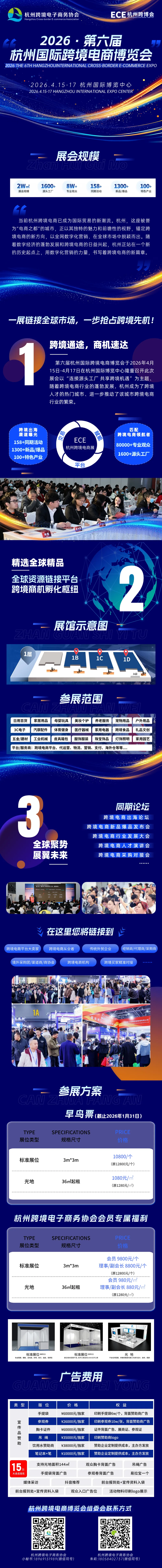 2026 年 4 月 15 日 - 17 日,杭州国际博览中心,第六届杭州国际跨境电商博览会邀您共赴这场行业盛会。 如需展位咨询、赞助合作,可直接扫描下方二维码咨询。