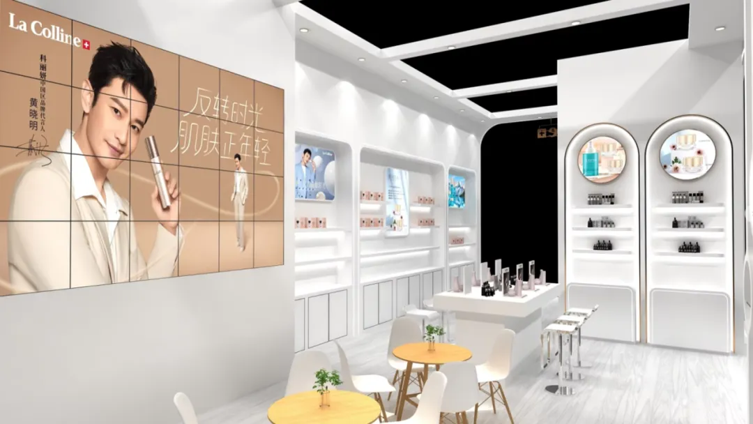 划分为品牌形象区、产品展示区、体验试妆区、洽谈签约区、互动打卡区,动线流畅不拥挤。