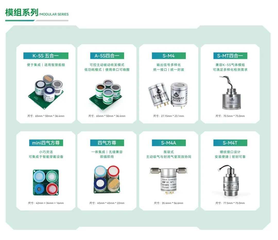 模组系列:K-5S五合一模组,A-5S四合一模组,mini四气方尊,四气方尊,S-M4模组,S-M4A模组,S-MT四合一模组等各类气体传感器模组,支持即插即用,实现灵活集成与快速部署。
