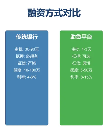 - 即使有抵押物,评估价值也很低 结果?**被银行拒之门外。** ### 痛点3:征信有污点,无处可借 一次逾期、一次失信记录,就会被银行列入黑名单。即使后来改正了,也很难再获得银行贷款。 --- ## 第二部分:小微企业的融资新出路 好消息是:**这些痛点都有解决方案。** ### 方案1:助贷平台 — 快速、灵活、门槛低 什么是助贷?简单说,就是专门为小微企业和个人提供快速融资的平台。 **核心优势:** | 对比项 | 银行 | 助贷平台 |