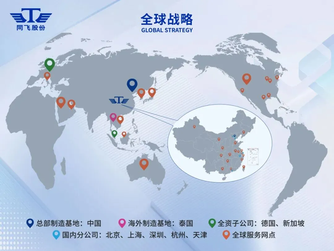 随着细分领域的不断拓展,同飞股份的服务布局也加速迈向全球化。目前,公司在国内已设立18个服务办事处,实现国内市场的全面覆盖,能够快速响应客户需求,提供及时、专业的售后保障;同时,积极布局国际服务网络,现已建成包括德国子公司、新加坡子公司、泰国生产基地在内的服务网络,覆盖全球13个国家和地区,且仍在持续拓展中,让全球客户都能享受到同飞的优质产品与专业服务,彰显了中国智造的全球影响力。