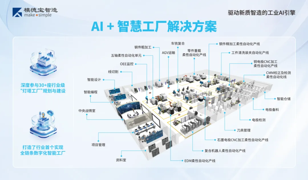 针对精密模具、精密零件领域的多品种小批量生产难题,模德宝推出全场景智慧工厂解决方案,以柔性自动化产线为核心,融合模云工业互联网平台与AI技术,实现生产过程的智能调度、动态优化与质量追溯,助力企业实现"小批量、快交付、高品质"的生产目标,推动行业全面升级。