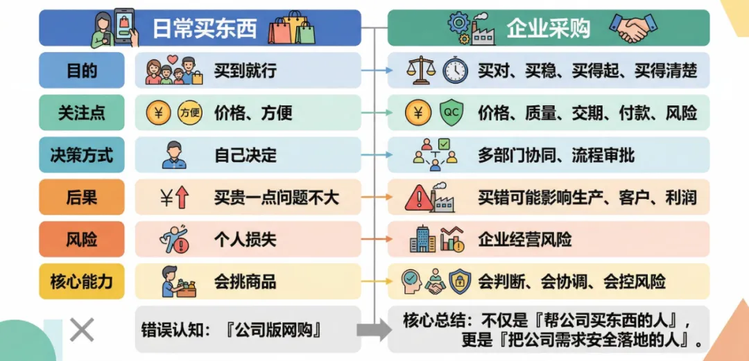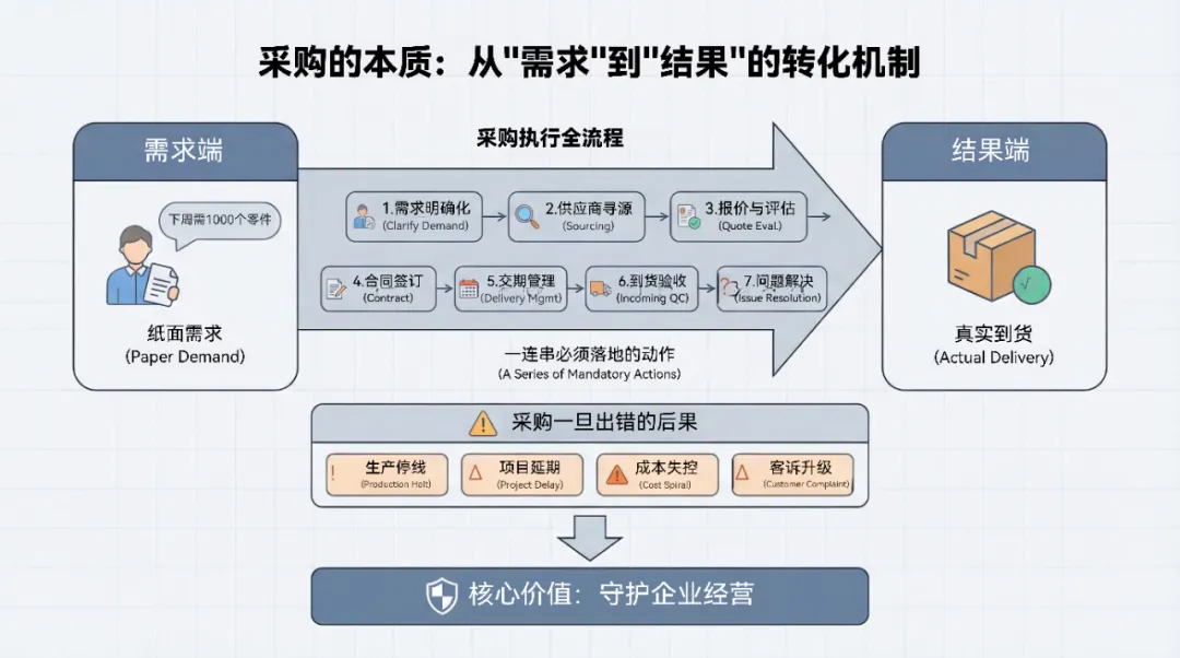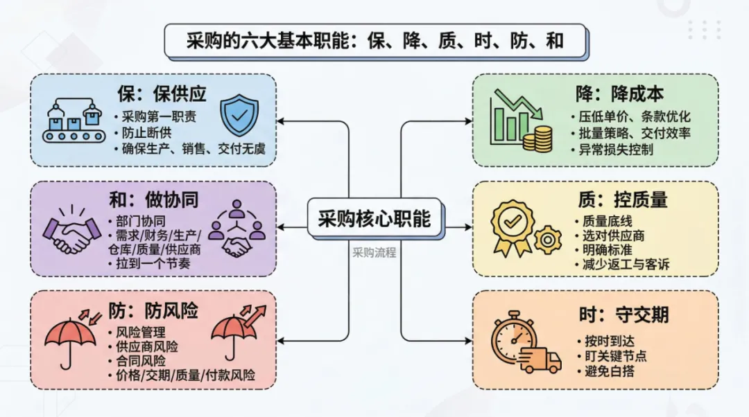 很多人一开始接触采购,会觉得这个岗位不就是“买东西”吗? 下单、催货、比价、跟供应商打交道,好像谁都能做。但做久了你就会发现,采购远不是“买买买”这么简单。 采购这个岗位,表面上看是在买东西,实际上是在替公司守几条最关键的底线:供应不断、成本不乱、交期不炸、质量不掉。所以,采购不是一个“没什么前途”的岗位。 恰恰相反,它是最容易看清一家企业是怎么运转的岗位之一。因为采购每天接触的,不只是供应商。 你会对接需求部门、财务、生产、仓库、质量、法务,甚至老板。 你会慢慢发现,一张订单后面,连着的不是一笔采购动作,而是一整条经营链条。第一,这个岗位能看到企业最真实的一面。 一个公司现金流紧不紧、计划乱不乱、需求稳不稳、流程顺不顺,采购最容易感受到。 很多问题,别的部门还没看见,采购已经先接住了。第二,采购对利润是有直接影响的。 不是只有压价才叫创造价值。 你把报价口径锁清楚,少了一轮重报; 你把交期节点盯住,少了一次停工; 你把验收标准确认好,少了一场扯皮。 这些最后都会落到成本上。第三,采购做得好,最后会变成公司里少数“既懂业务、又懂风险”的人。 因为你天天在做的,本质上不是“买”,而是“判断”。比如需求部门说: “下周要用1000个零件。” 这句话在别人那里可能只是一个需求, 但到了采购这里,就变成了一连串必须被落地的动作:你会发现,采购不是简单地下一个单, 而是要把一件事情从“纸面需求”一路推进到“真实到货”。所以采购一旦出错,后果从来不只是“买错了一个东西”。 背后更可能是:这也是为什么说,采购表面在买货,实质上是在守经营。很多新人刚做采购时,最容易犯的一个错,就是把企业采购想成“公司版网购”。所以说,采购不是“帮公司买东西的人”, 而是“把公司需求安全落地的人”。我一般喜欢把采购的核心职能概括成六个字: 保、降、质、时、防、和。