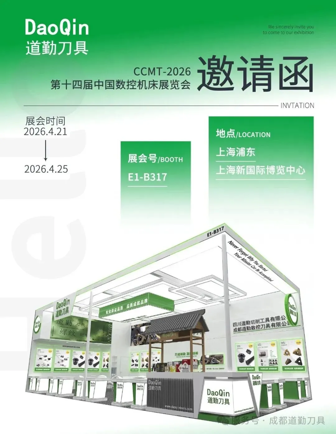 以“用心做好每一粒刀片”为内核,用匠心打磨每一款产品,新品更在精度提升、寿命延长、效率优化上实现突破。诚邀您亲临现场,近距离品鉴新品实力,共话切削工具领域的技术升级与合作商机,4月上海,不见不散!联系方式☎️Website: www.daoqintools.comTel: 86-28 81448033Fax: 86-28-81447533