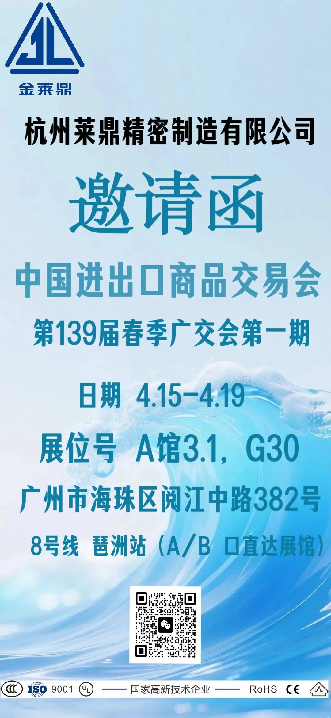 我们诚挚地邀请您参加将于2026年4月15日至19日举办的第139届中国进出口商品交易会(广交会)春季第一期展会。杭州莱鼎精密制造公司将携新品重磅亮相,诚邀全球客户、合作伙伴莅临展位,共探冷链科技新趋势,共谋合作新机遇!