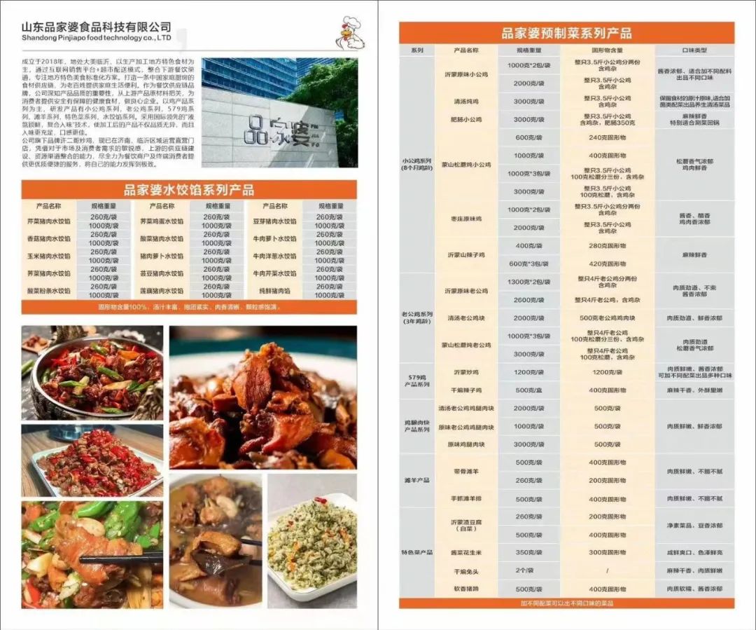 山东品家婆食品科技有限公司,专做临沂炒鸡等全系列鸡产品预制菜的企业。产品口感还原度接近百分百,品类涵盖老公鸡、黑爪小公鸡、黄爪小公鸡等高低价位的全系列鸡产品,加工方法有酱炒的、松蘑炖的、清汤的、整只的、小份的都有;特别适合餐饮、零售、电商等渠道!还有调配好的馅料等产品,同时依托鸡产品预制菜我们有自己直营的许二哥临沂炒鸡连锁餐厅四个,所以产品口味已经过市场深度磨练,是您鸡系列菜品的不二选择!有需求随时报价参考