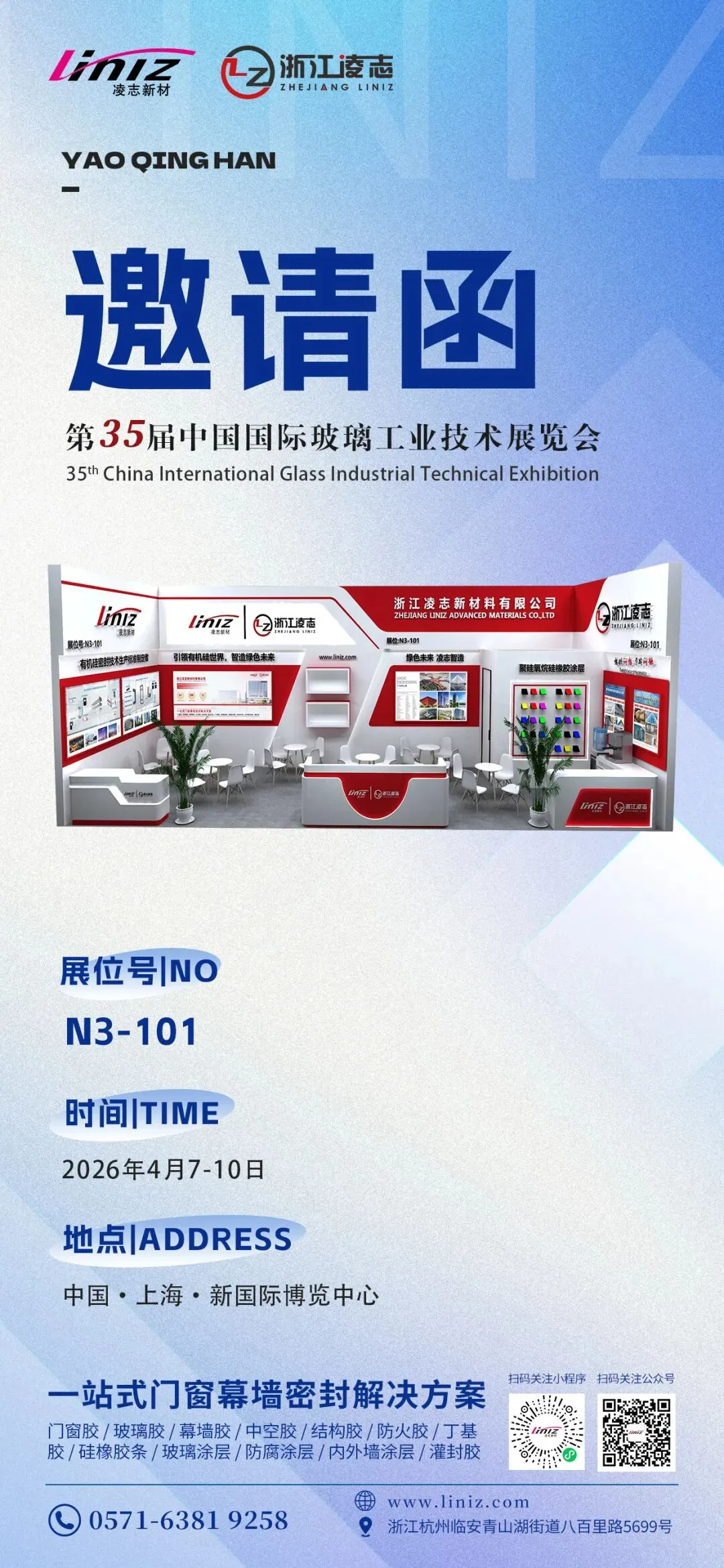 春风启新程,盛会再相逢!第 35 届中国国际玻璃工业技术展览会即将于 2026 年 4 月 7-10 日,在上海新国际博览中心盛大启幕。浙江凌志新材料有限公司诚挚邀请您莅临 N3 馆 101 号展位,共探有机硅密封技术新机遇,共话行业绿色发展新未来!
