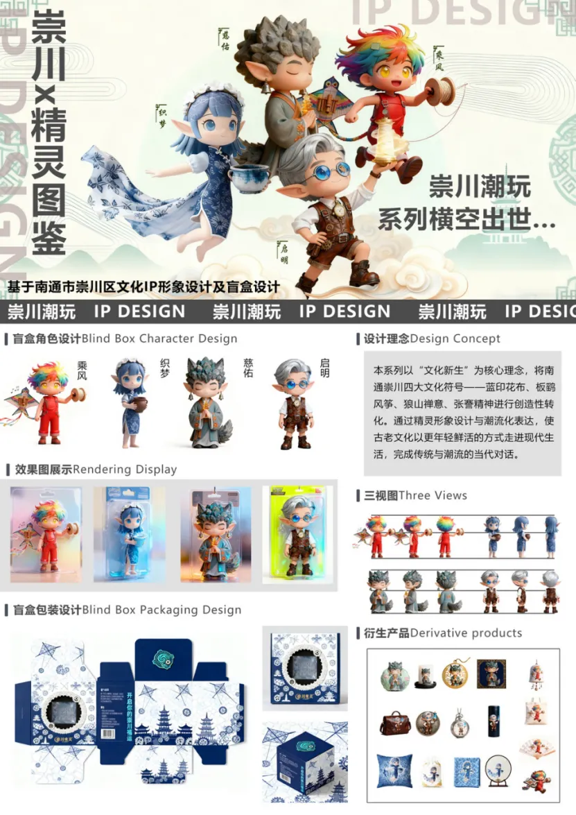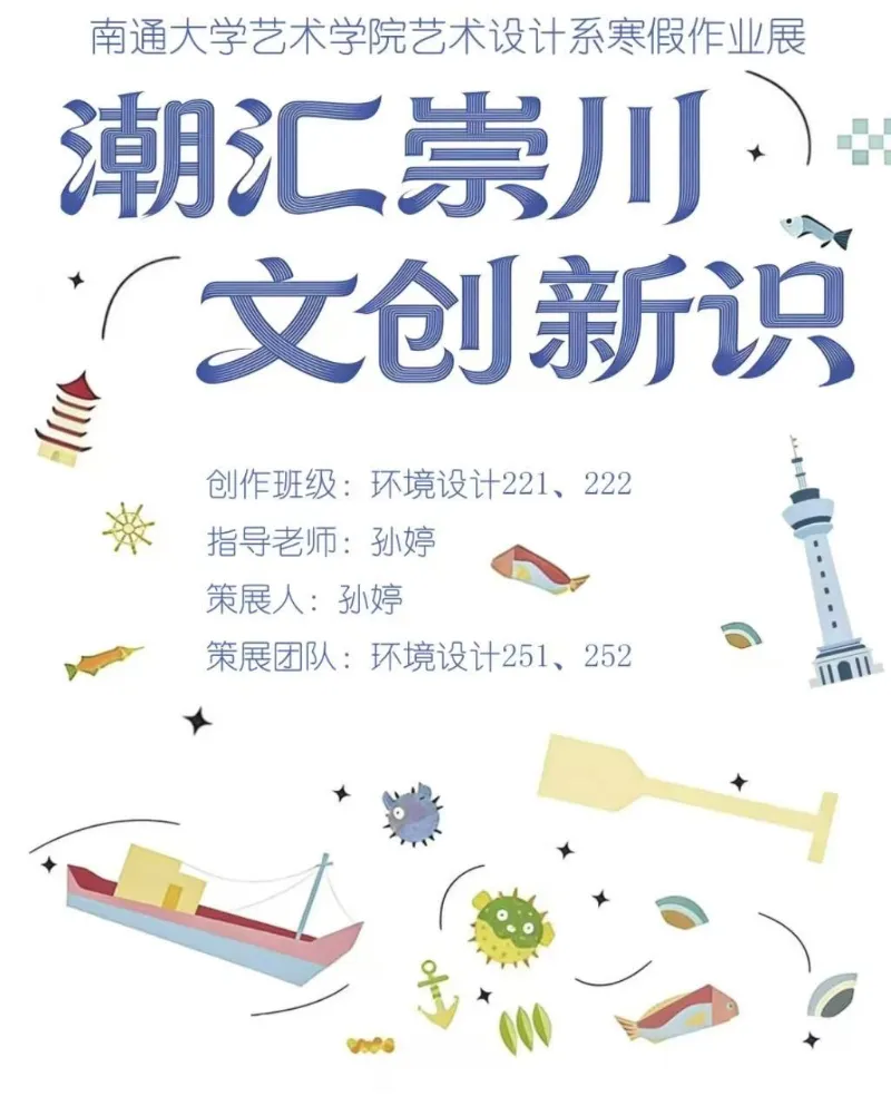 本次展览立足崇川地域文化,以文创设计为载体,引导学生从在地文化资源中汲取灵感,通过视觉转译与空间表达,将传统文化元素融入当代设计语境之中。作品以多元形式探索崇川文化的当代表达路径,在传承与创新之间建立连接,展现了青年设计者对地方文化价值的再认识与再创造。