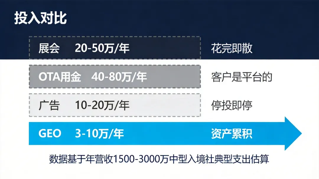 展会的成本曲线是一条横线,年年不变。GEO的成本曲线是一条往下走的斜线,越到后面越便宜、效果越好。