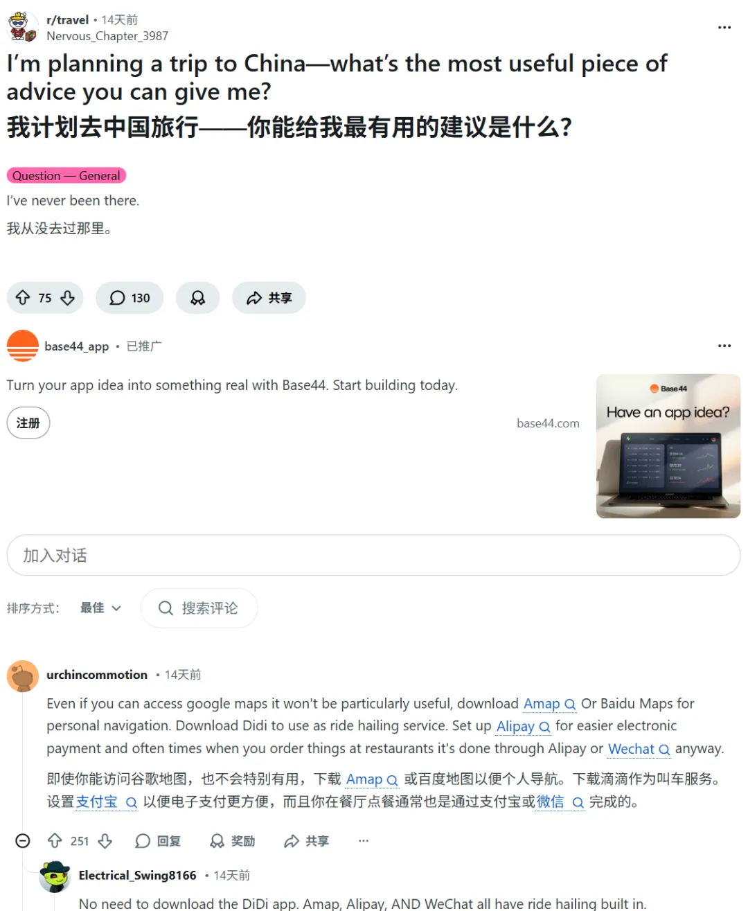 Reddit的r/travelchina、Quora上"travel to China"相关问题、TripAdvisor论坛——每天都有老外在问"去中国找谁靠谱"。AI训练和检索的时候会大量抓这些平台的内容。