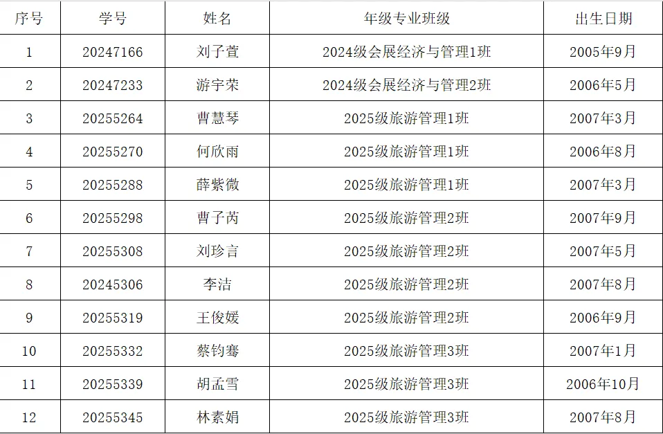 根据党员发展的相关规定和要求,经团支部推优,结合个人综合考察情况,会展经济与管理学生党支部研究讨论,现拟将刘子萱等12名同志列为入党积极分子并予以公示。