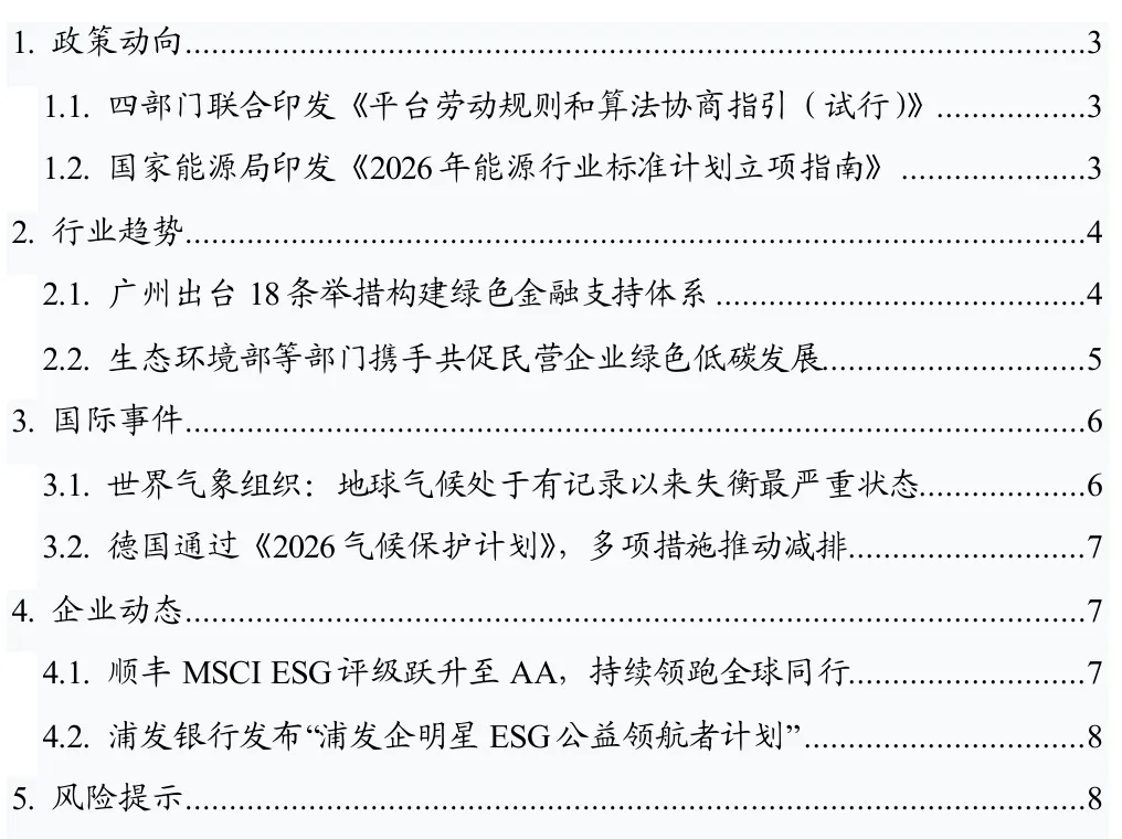 国际事件:(1)世界气象组织:地球气候处于有记录以来失衡最严重状态。 (2)德国通过《2026气候保护计划》,多项措施推动减排。