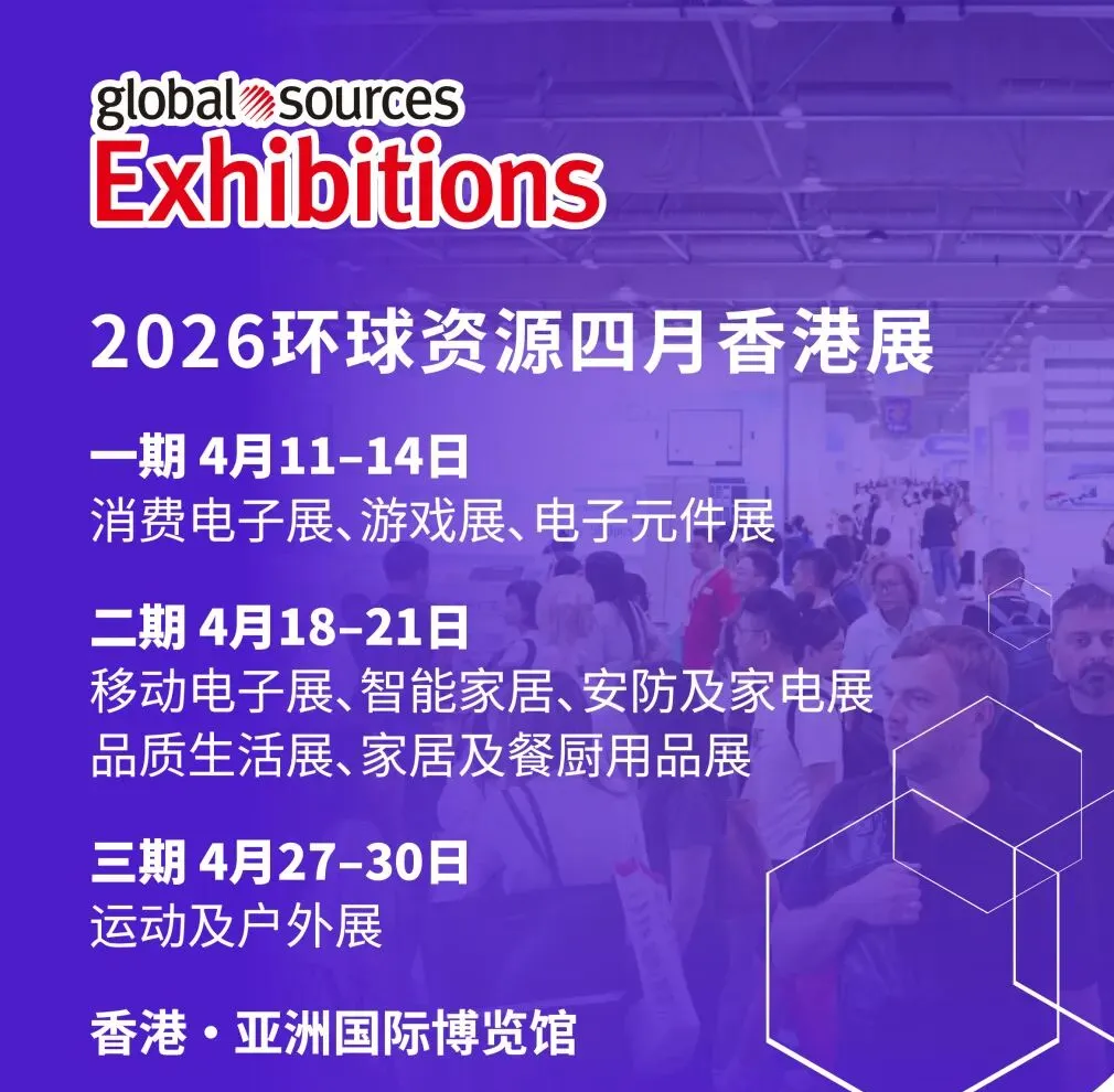 2026年4月11日至30日,环球资源香港展将在亚洲国际博览馆分三期举行,全面覆盖游戏、消费电子、电子元件、移动电子、智能家居、安防及家电、家居餐厨、品质生活、运动户外等高增长采购品类。