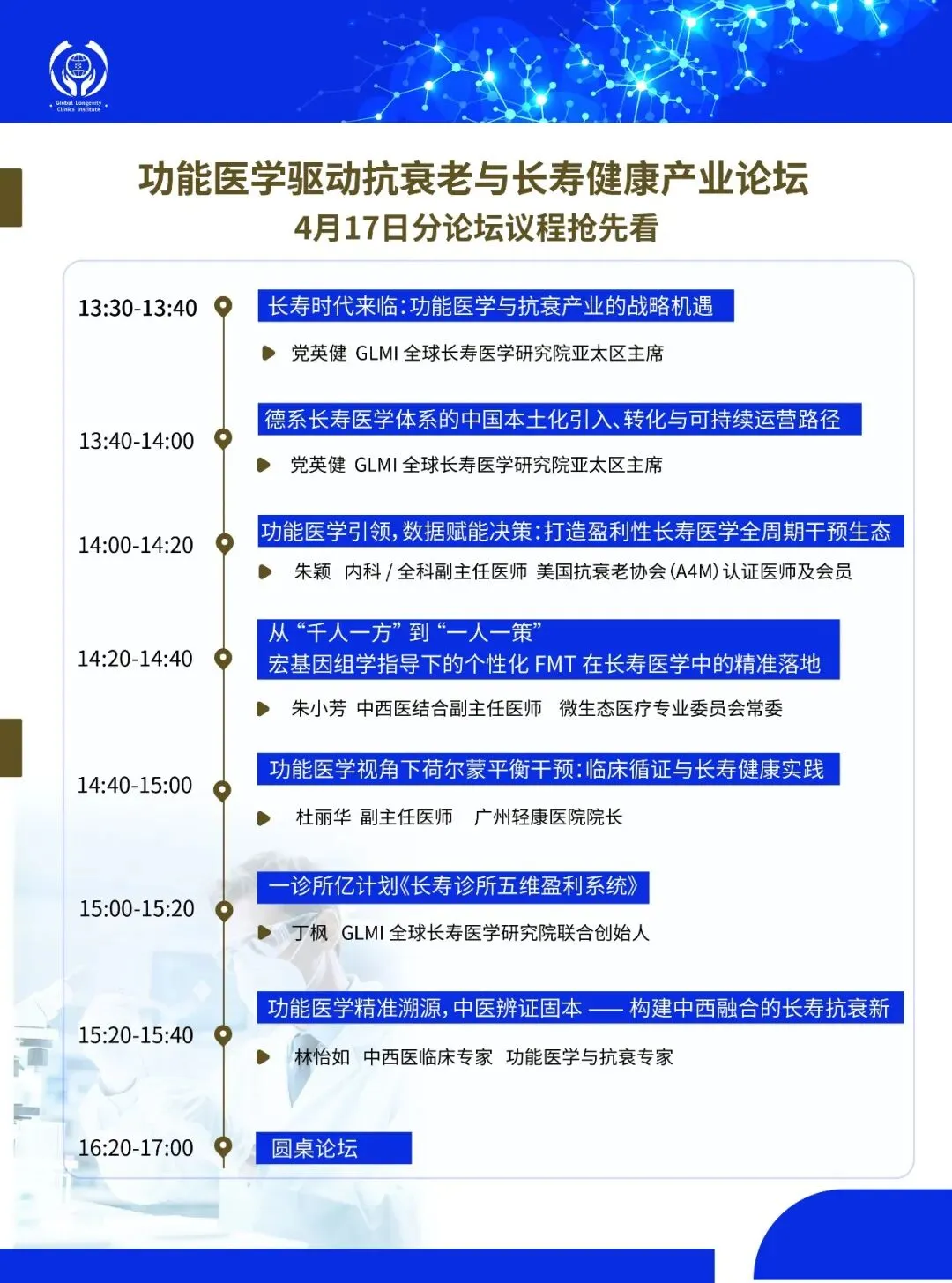4 月 17 日下午 13:30-17:00,GLMI 将主办 《功能医学驱动抗衰老与长寿健康产业论坛》,邀请行业权威专家分享前沿理念与实操路径,干货满满!