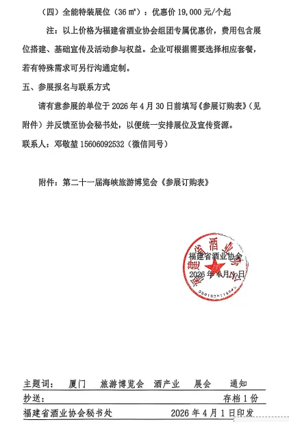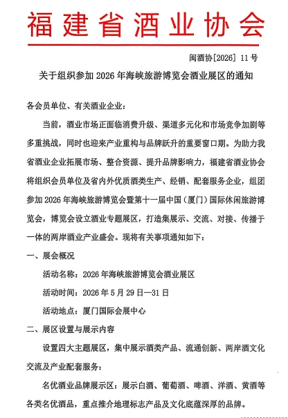 当前,酒业市场正面临消费升级,渠道多元化和市场竞争加剧等多重挑战,同时也迎来产业重构与品牌跃升的重要窗口期。为助力我省酒业企业拓展市场,整合资源,提升品牌影响力,福建省酒业协会将组织会员单位及省内外优质酒类生产,经销,配套服务企业,组团参加2026年海峡旅游博览会暨第十一届中国(厦门)国际休闲旅游博览会,博览会设立酒业专题展区,打造集展示、交流、对接、传播于一体的两岸酒业产业盛会。现将有关事项通知如下: