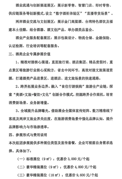 注:以上价格为福建省酒业协会组团专属优惠价,费用包含展位搭建、基础宣传及活动参与权益。企业可根据需要选择相应套餐,若有特殊需求可另行沟通定制。