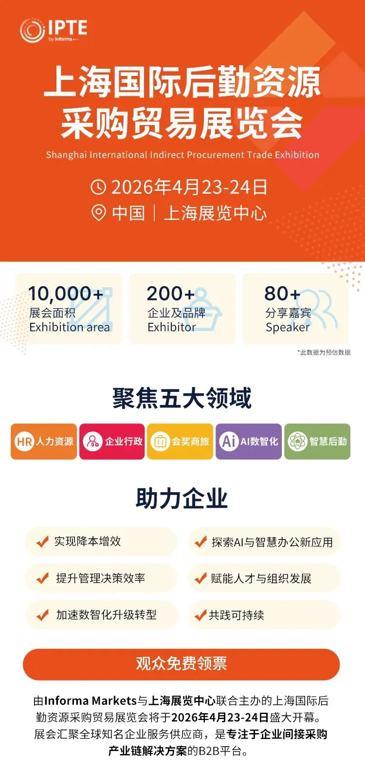 由Informa Markets与上海展览中心联合主办的上海国际后勤资源采购贸易展览会(IPTE),汇聚全球领先企业服务供应商,是专注于企业后勤采购产业链解决方案的B2B平台。展会面向HR、行政、商旅、财务、法务、IT等领域的采购决策者,提供一站式资源对接、行业洞察与最佳实践分享平台。