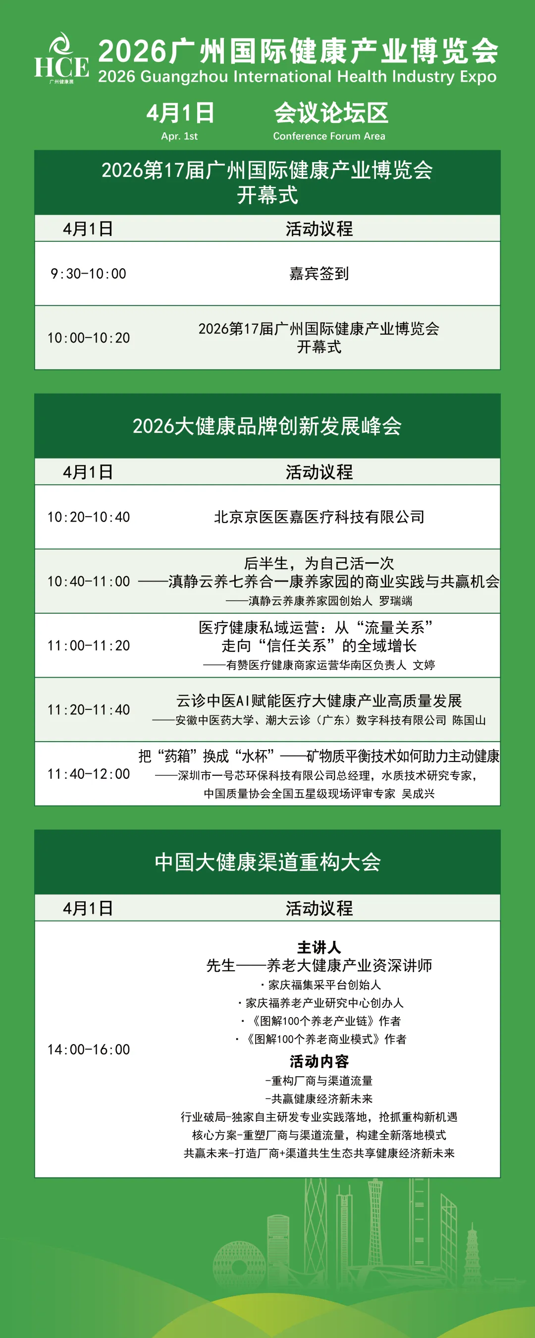 火热开展中!2026 HCE广州国际健康产业博览会将于2026年4月1日至3日在广州保利世贸博览馆举行,作为华南地区极具影响力的大健康行业盛会,汇聚全球优质资源搭建高效联动交流平台。