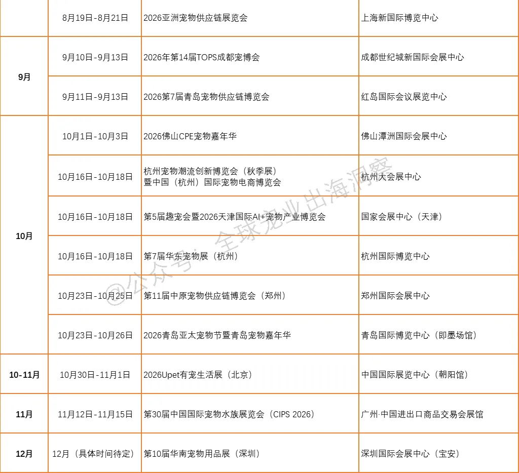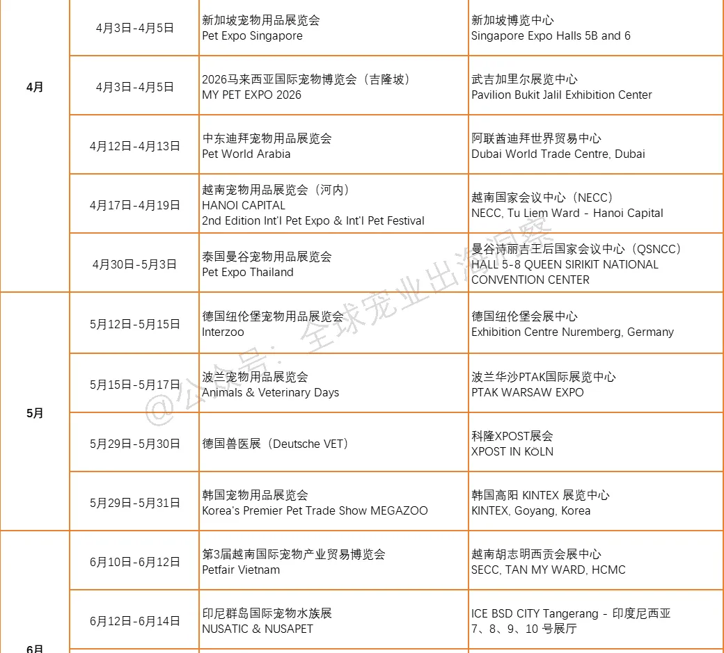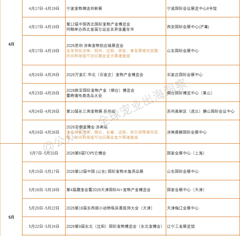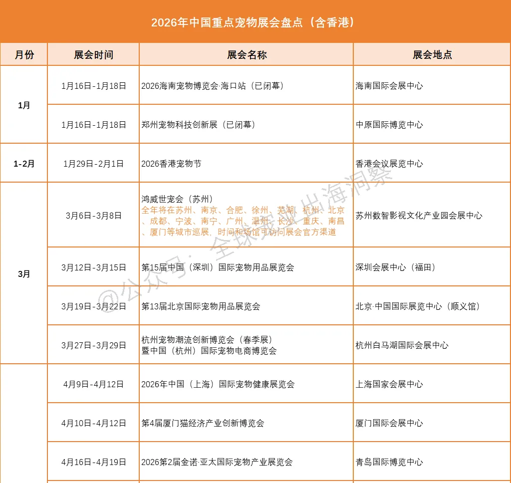 建议收藏阅读。本文,全球宠业出海洞察将为大家全面盘点2026年国内与海外核心宠物展会,不涵盖其他尚未公布或临时举办的宠物展会。