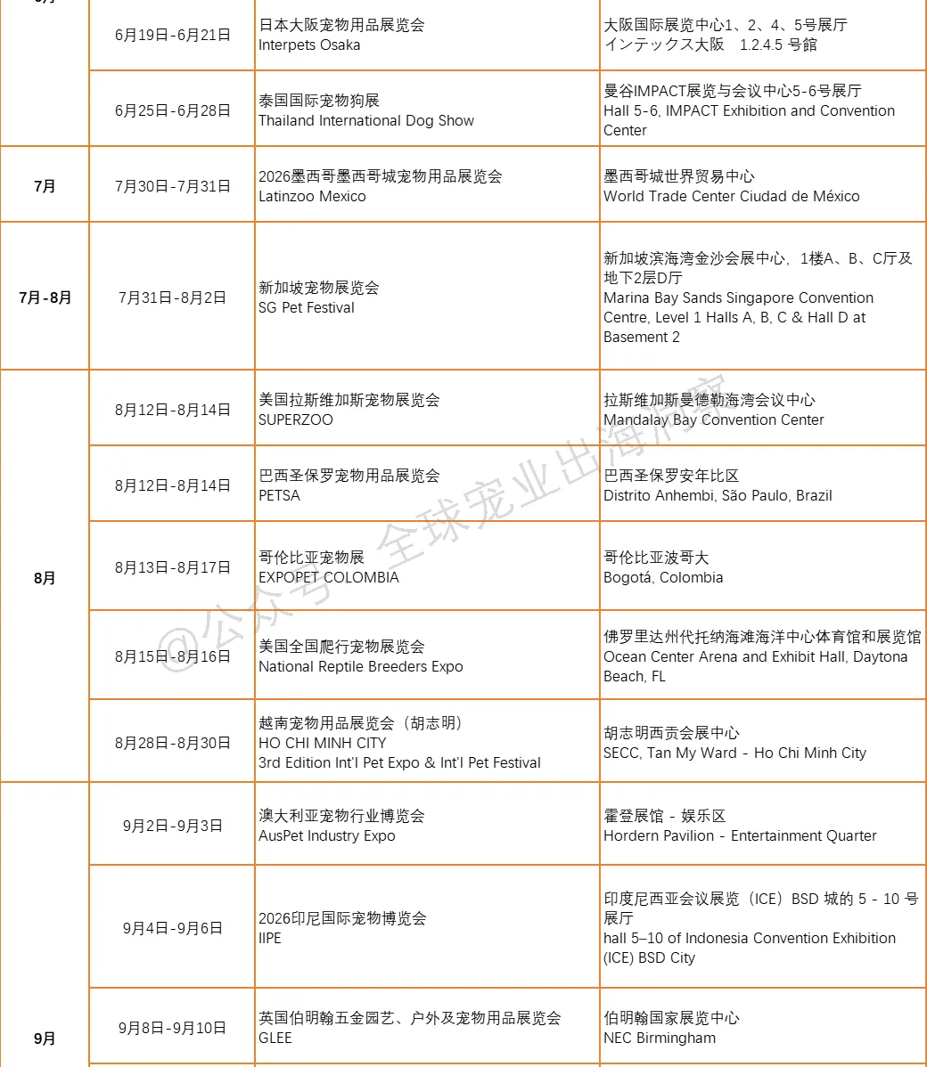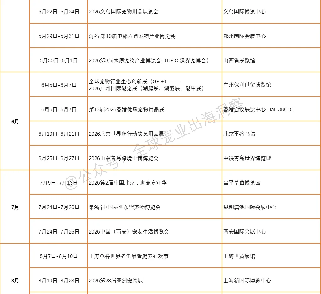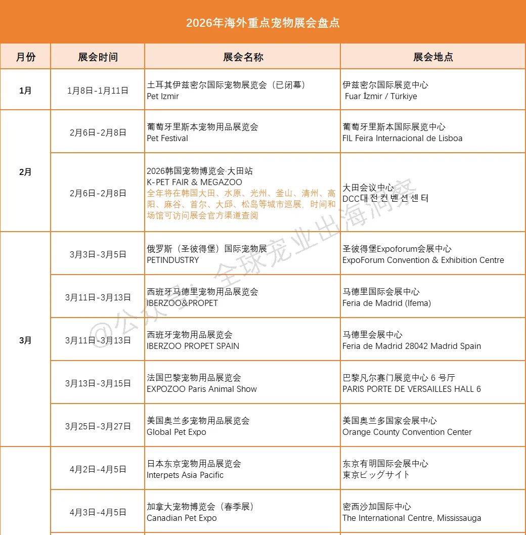 建议收藏阅读。本文,全球宠业出海洞察将为大家全面盘点2026年国内与海外核心宠物展会,不涵盖其他尚未公布或临时举办的宠物展会。