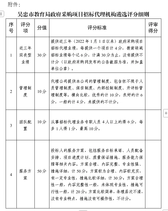 附件:吴忠市教育局政府采购项目招标代理机构遴选评分细则