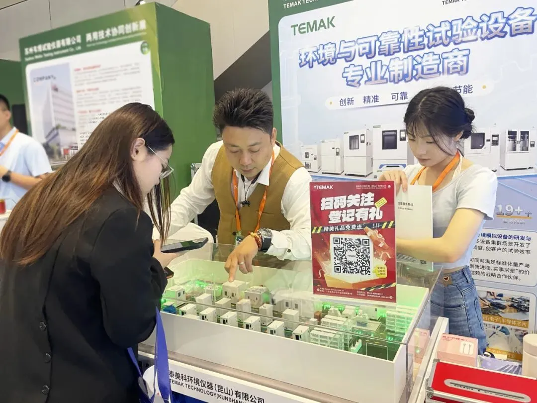 本次展会上,泰美科重点展示了一套精心制作的实验室沙盘,将环境试验室的布局、设备配置和测试流程直观呈现出来。不少专业观众在沙盘前驻足观看,并结合自身测试需求向技术人员提问。