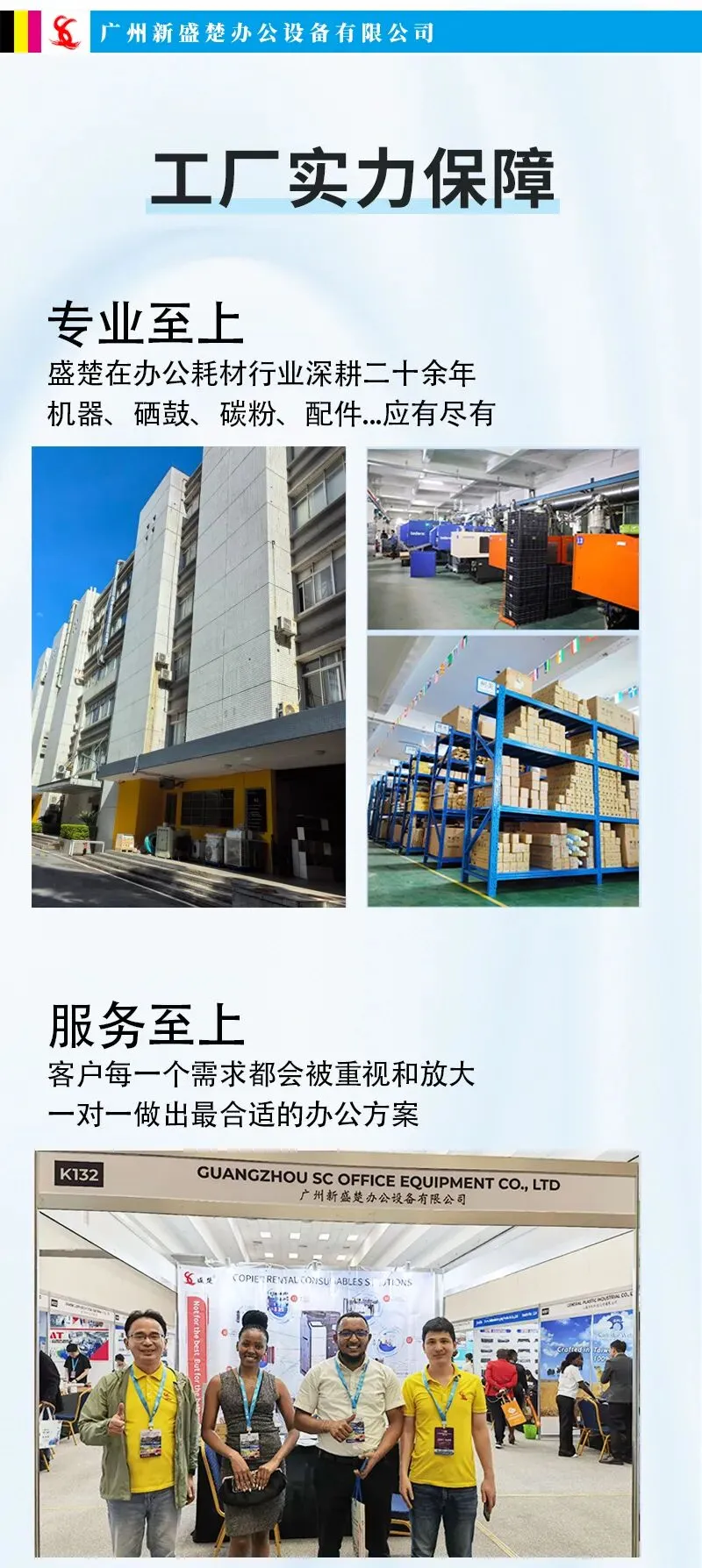 广州新盛楚办公设备有限公司是一家集生产、销售、服务为一体的打印机复印机耗材厂商。在办公耗材行业深耕二十余年,主营理光、柯美、夏普、京瓷、佳能、施乐、东芝等全系列碳粉及配件,你想要的我都有。